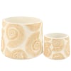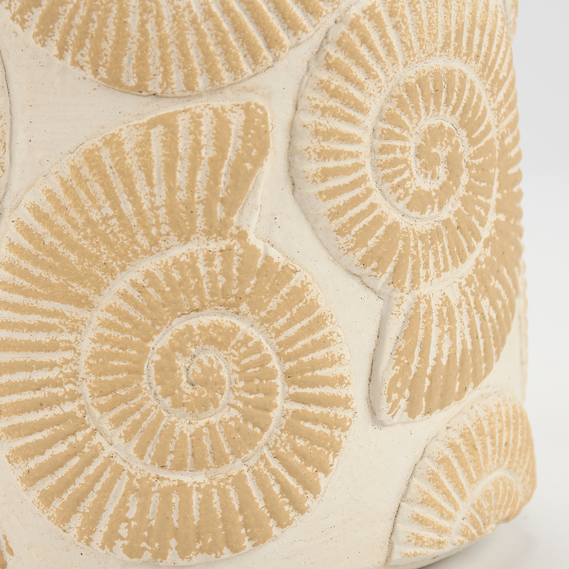 A set of 2 cement planters from our Beach Collection displaying embossed designs of nautilus shells around the outside with painted details. Our Nautilus Shell planter set features openings on top to place greenery or décor. Greenery pictured not included. A set of beach-themed plant accessories with a variety of display options.
