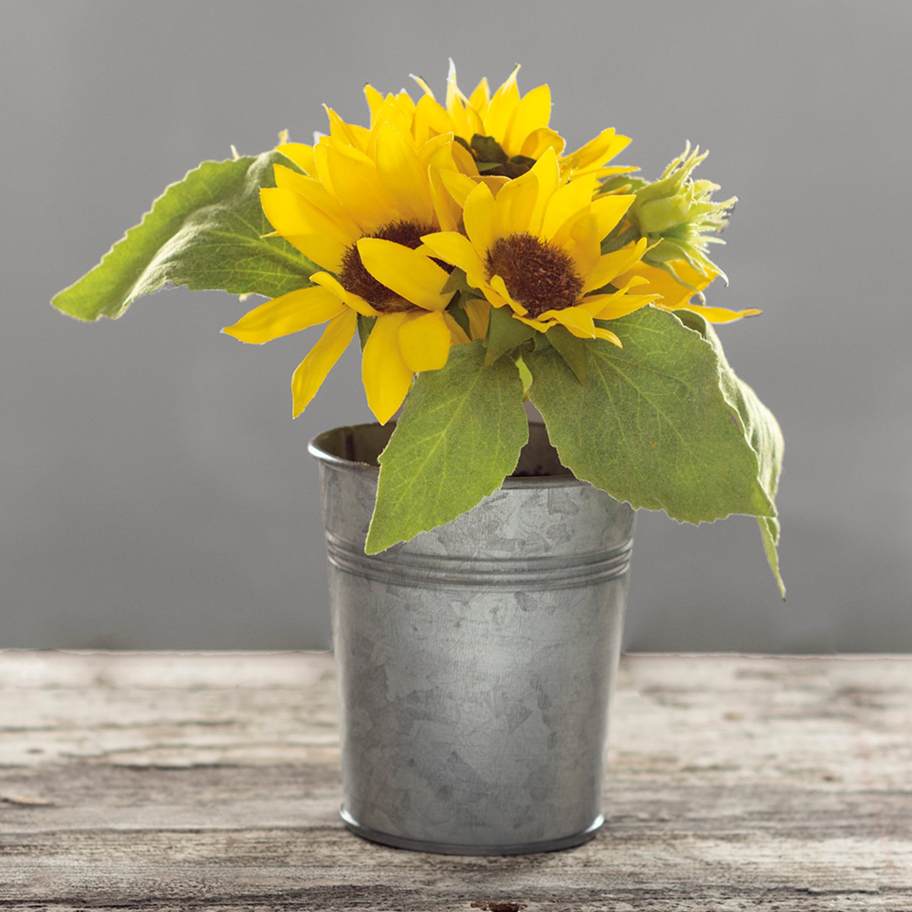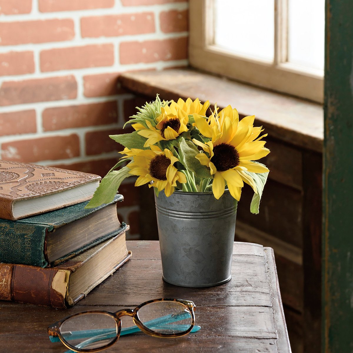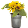 A small metal gardening bucket featuring faux sunflowers. Complements well with coordinating pieces in collection for a charming indoor garden.