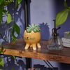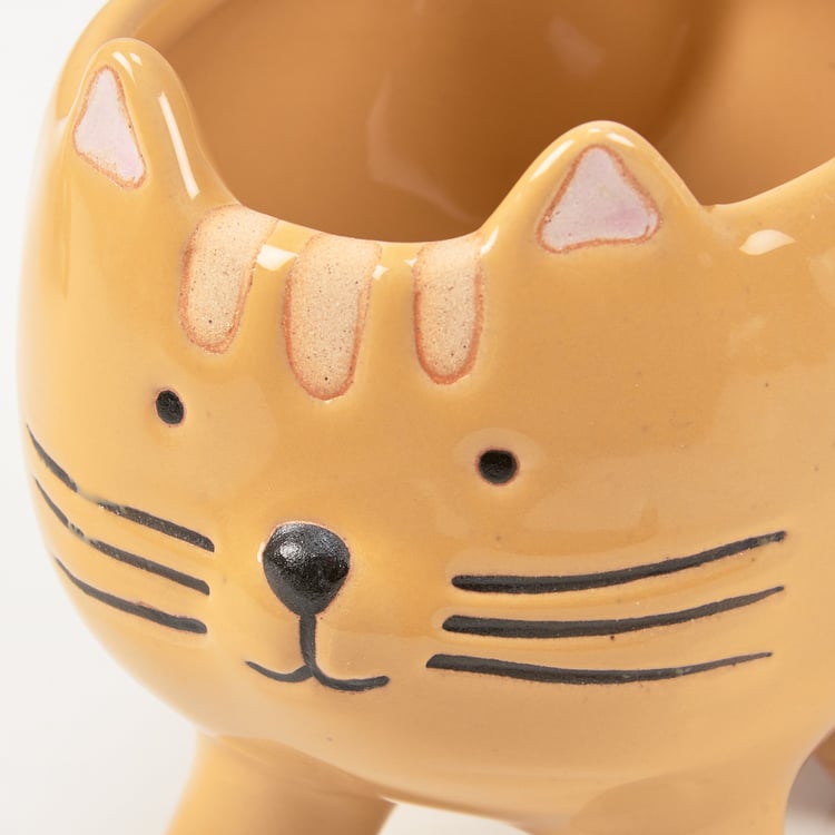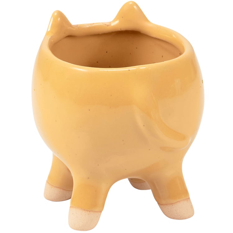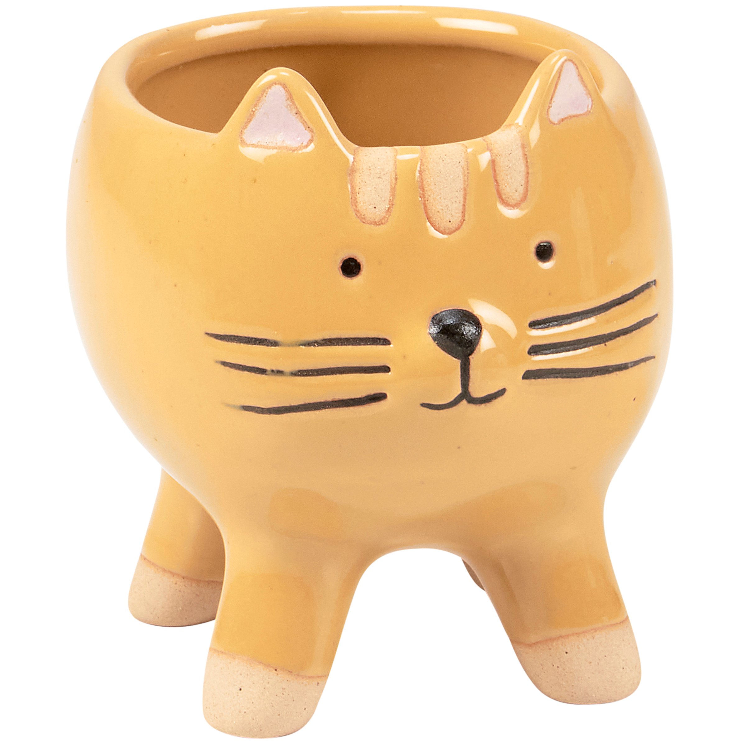 A ceramic planter from our Pet Collection displaying a cute tabby cat design with a orange gloss finish and bare ceramic details throughout. Our Tabby Cat planter features opening on top to place plants or small décor. Greenery pictured not included. A fun pet-themed plant accessory with a variety of display options.