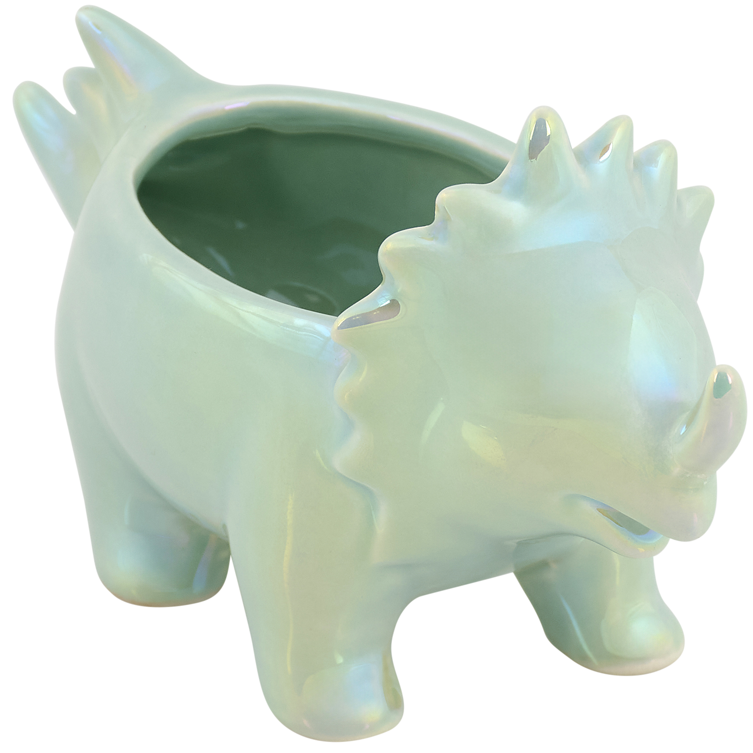 A ceramic planter from our Botanical Collection displaying a cute retro triceratops design with an iridescent pastel blue finish. Our Triceratops planter features an opening on its back to place plants or small décor. Greenery pictured not included. A fun dinosaur-themed plant accessory with a variety of display options.