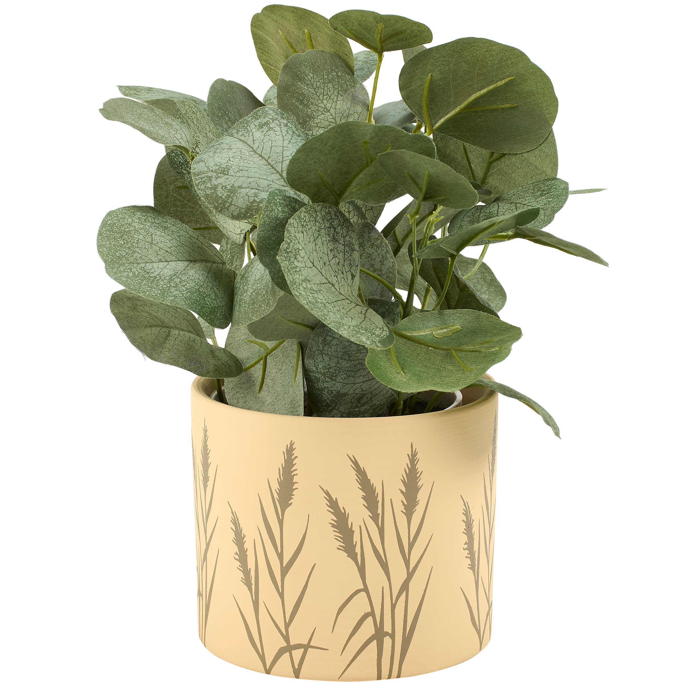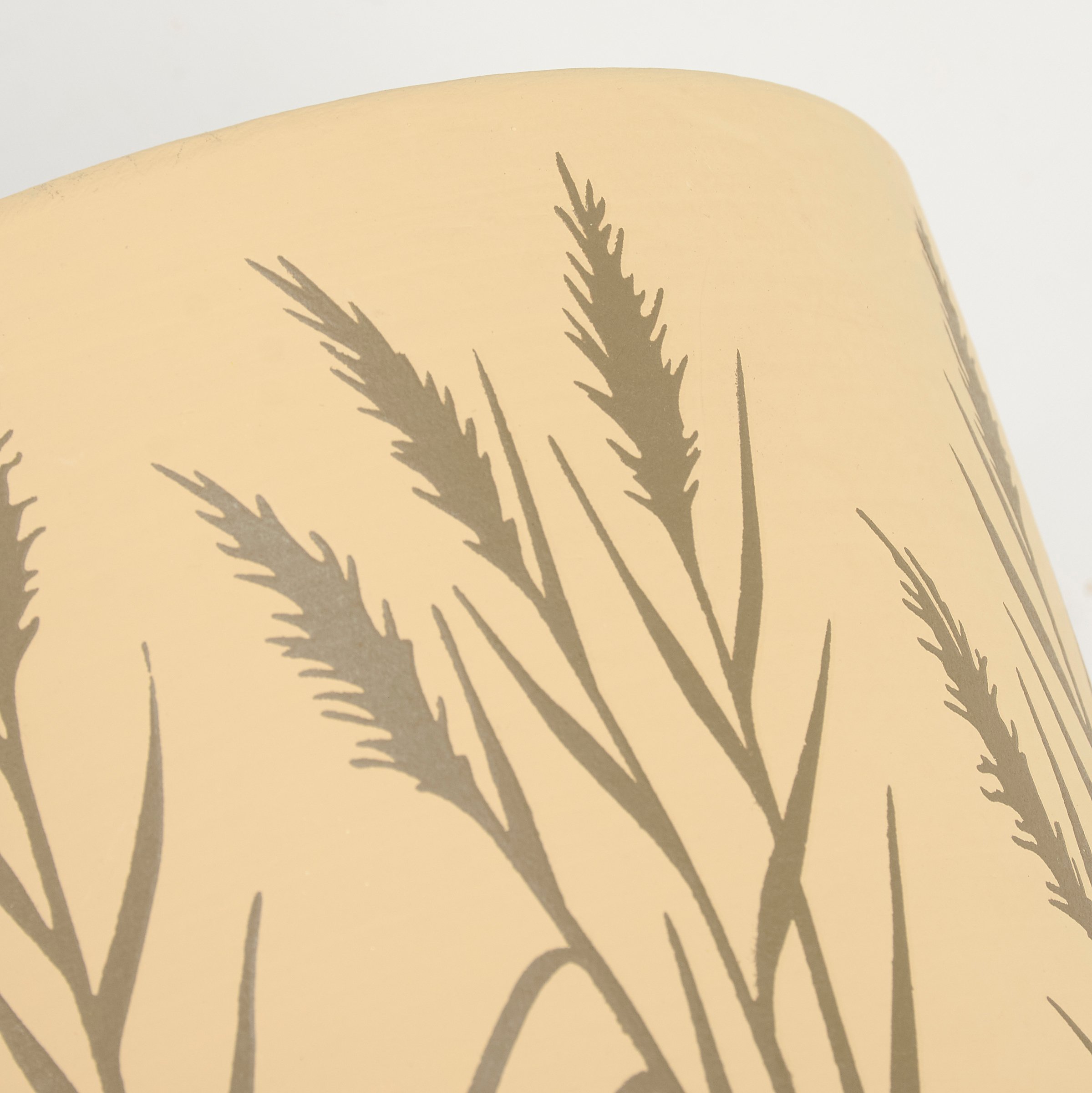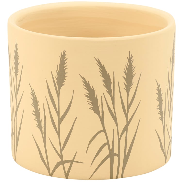A ceramic planter from our Cottagecore Collection displaying debossed wheat designs with colored painted accents. Our Wheat planter features an opening on top to place greenery or décor. Greenery pictured not included. A stylish plant accessory with a variety of display options.