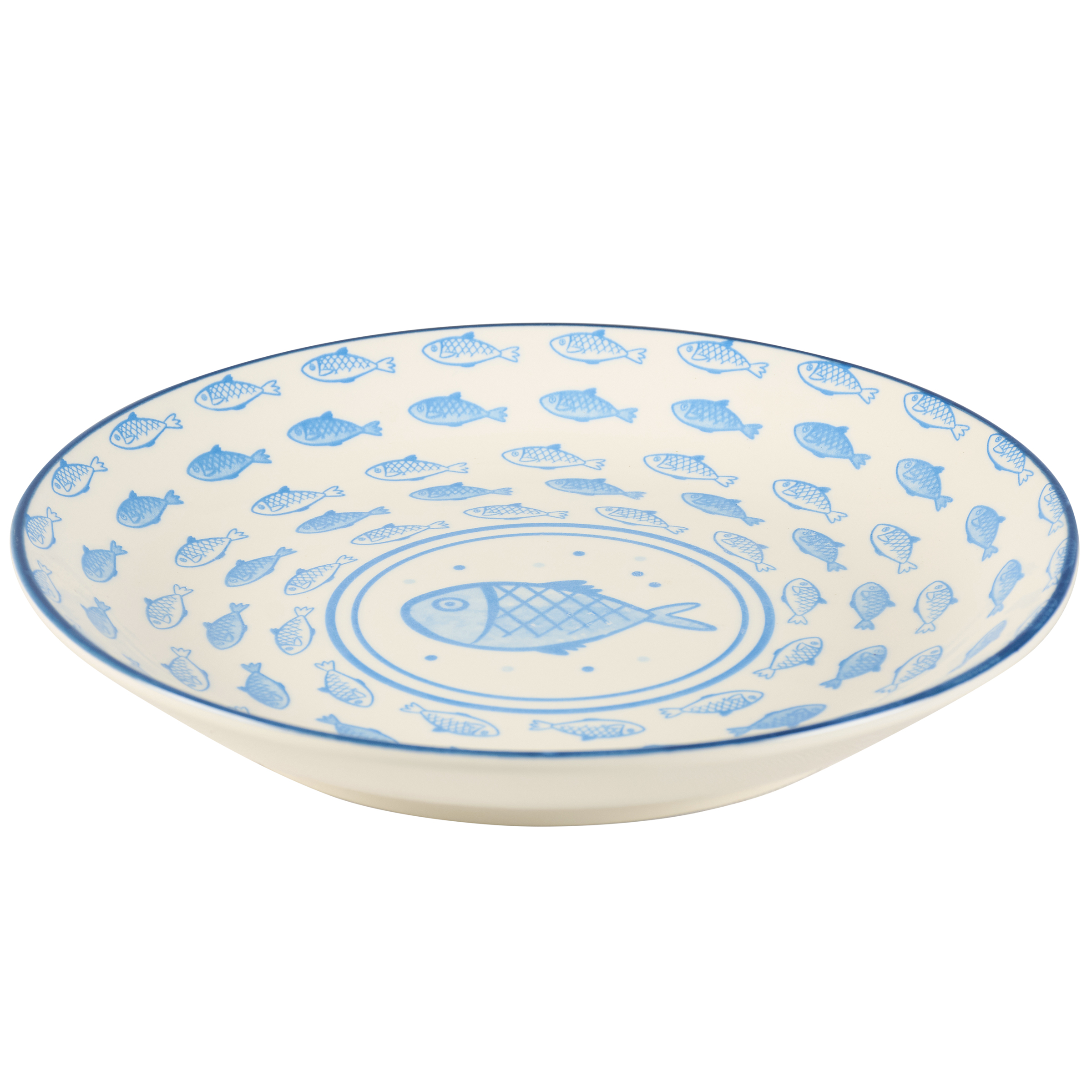 A durable stoneware plate from our Beach Collection displaying a hand illustrated pattern of swimming fish on the inside with a large fish design in the center of the plate. Our Blue Fish plate is conveniently microwave, oven, dishwasher, and food safe for easy use. A piece of fun dishware perfect for beach-themed tablescapes.