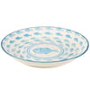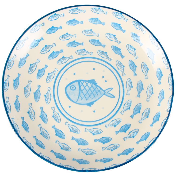A durable stoneware plate from our Beach Collection displaying a hand illustrated pattern of swimming fish on the inside with a large fish design in the center of the plate. Our Blue Fish plate is conveniently microwave, oven, dishwasher, and food safe for easy use. A piece of fun dishware perfect for beach-themed tablescapes.