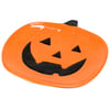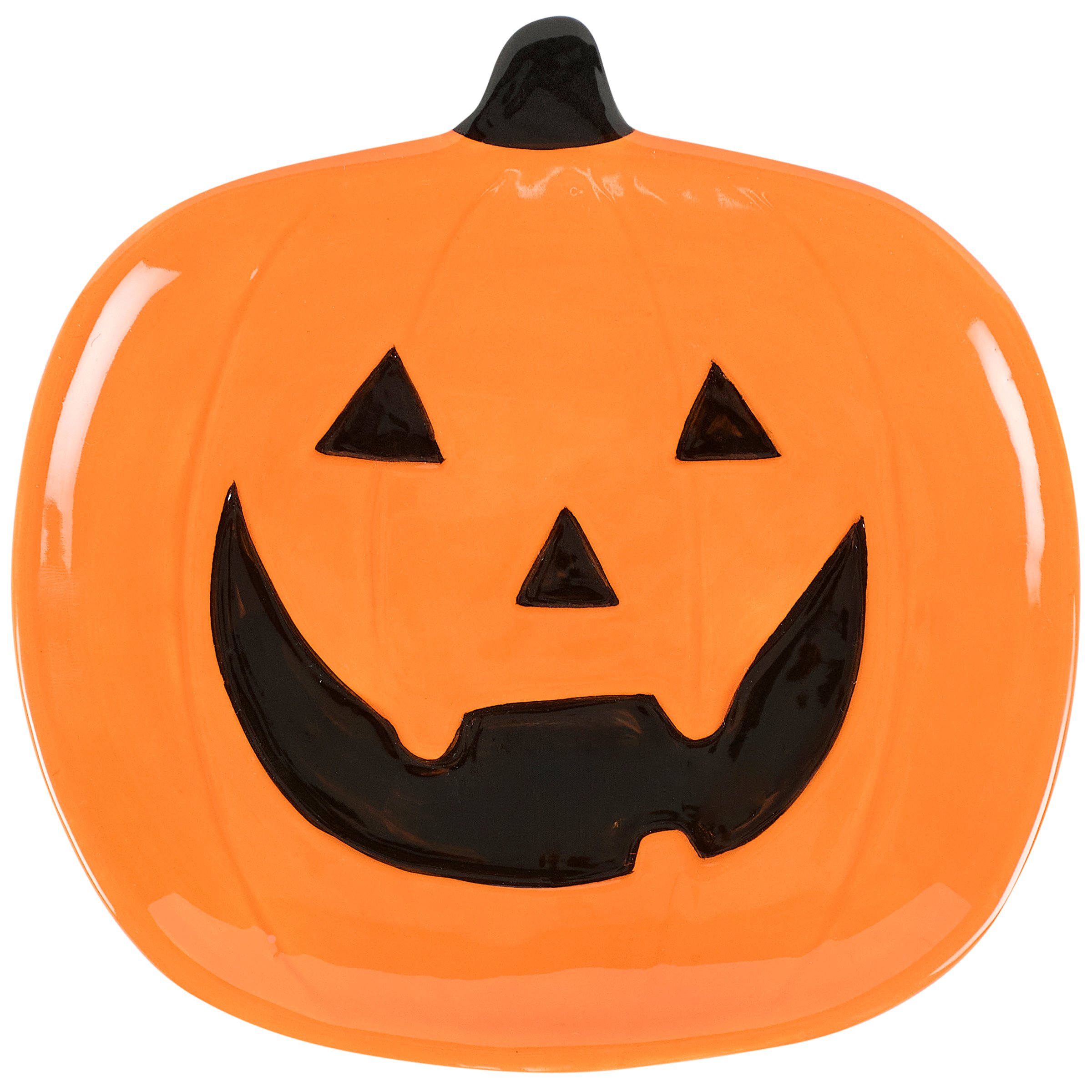 A ceramic plate from our Halloween Collection in the shape of the displayed jack o'lantern design featuring colorful glaze finish and painted details. Our Jack O'Lantern plate can be used as seasonal tableware or vintage home décor. Hand wash only; not microwave safe. A piece of vintage Halloween dishware perfect for seasonal gatherings.