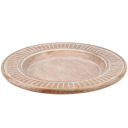 A large wooden charger plate from our Farmhouse Collection displaying a simple, earthy design with a ribbed design along the border. Our Ribbed Wood Charger plate is designed to be used as tableware or décor. A neutral home accent that coordinates with a variety of everyday or seasonal styles. Recommended to wipe clean with a damp cloth.