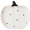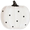 A set of three white pumpkin-shaped stoneware plates with black polka dots in various sizes. Microwave, oven, dishwasher, and food safe.