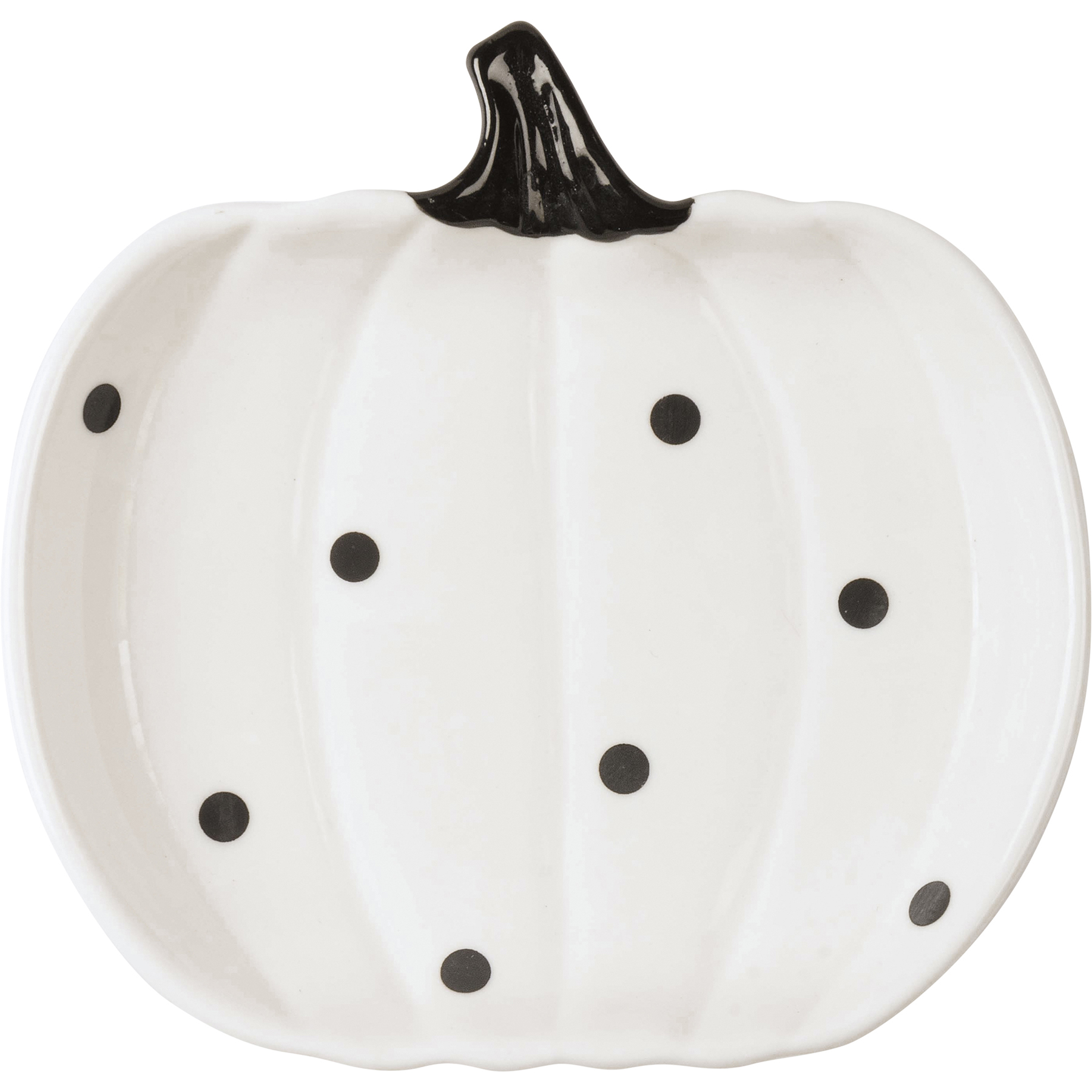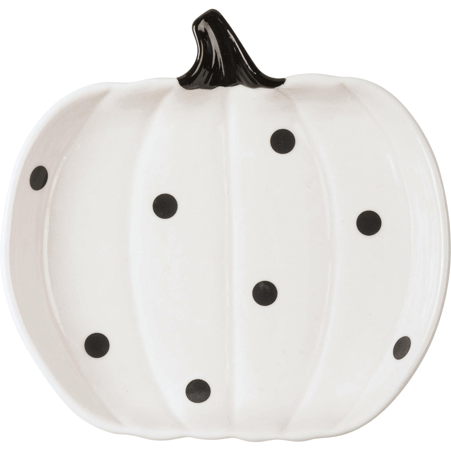 A set of three white pumpkin-shaped stoneware plates with black polka dots in various sizes. Microwave, oven, dishwasher, and food safe.