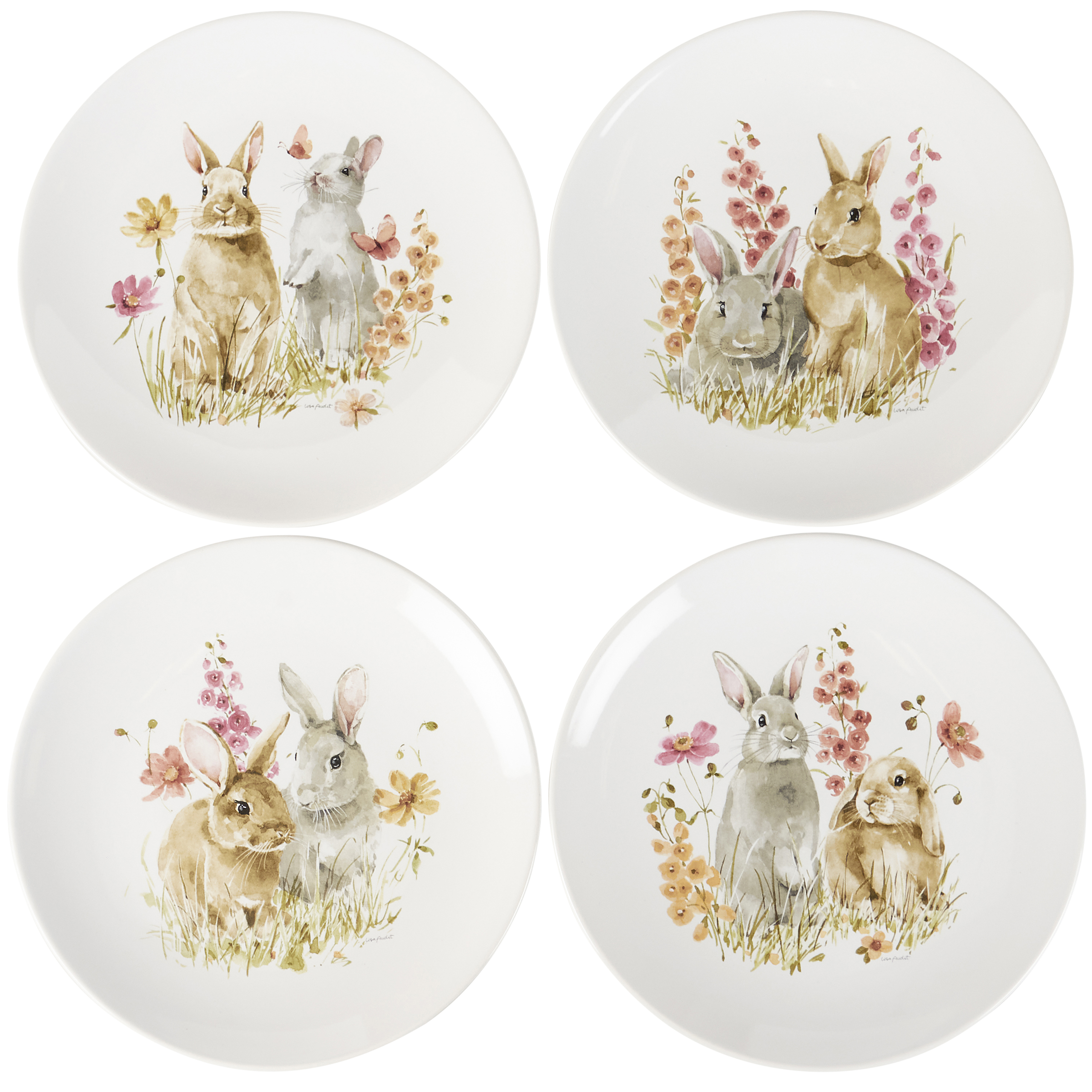 A coordinating set of stoneware plates from our Easter & Spring Collection displaying four individual designs of charming bunnies with delightful spring flowers. Designs are replicated from original artwork hand painted in a delicate watercolor style. Our Flower Bunnies plate set includes four durable stoneware 8 inch plates that are microwave, oven, and dishwasher safe for easy use. A charming tableware set perfect for holiday gatherings or seasonal display.
