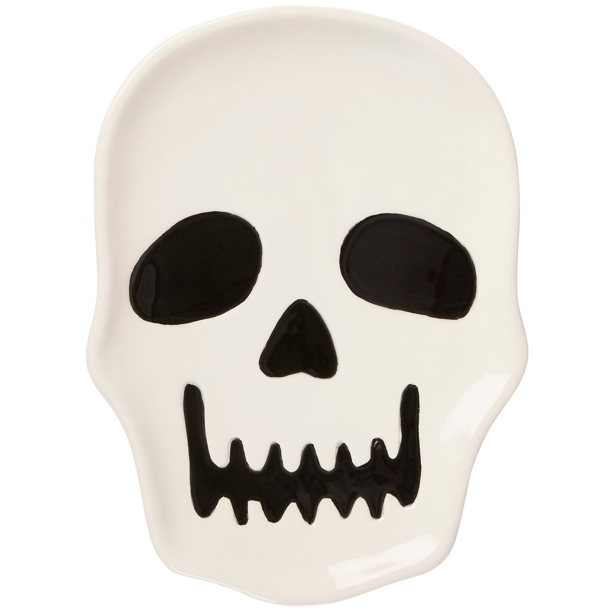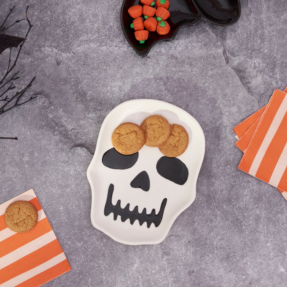 A durable ceramic plate from our Halloween Collection in the shape of the displayed black and white skull design. Our Skull plate can be used as seasonal tableware or home décor. A fun piece of skeleton-themed tableware perfect for seasonal gatherings.