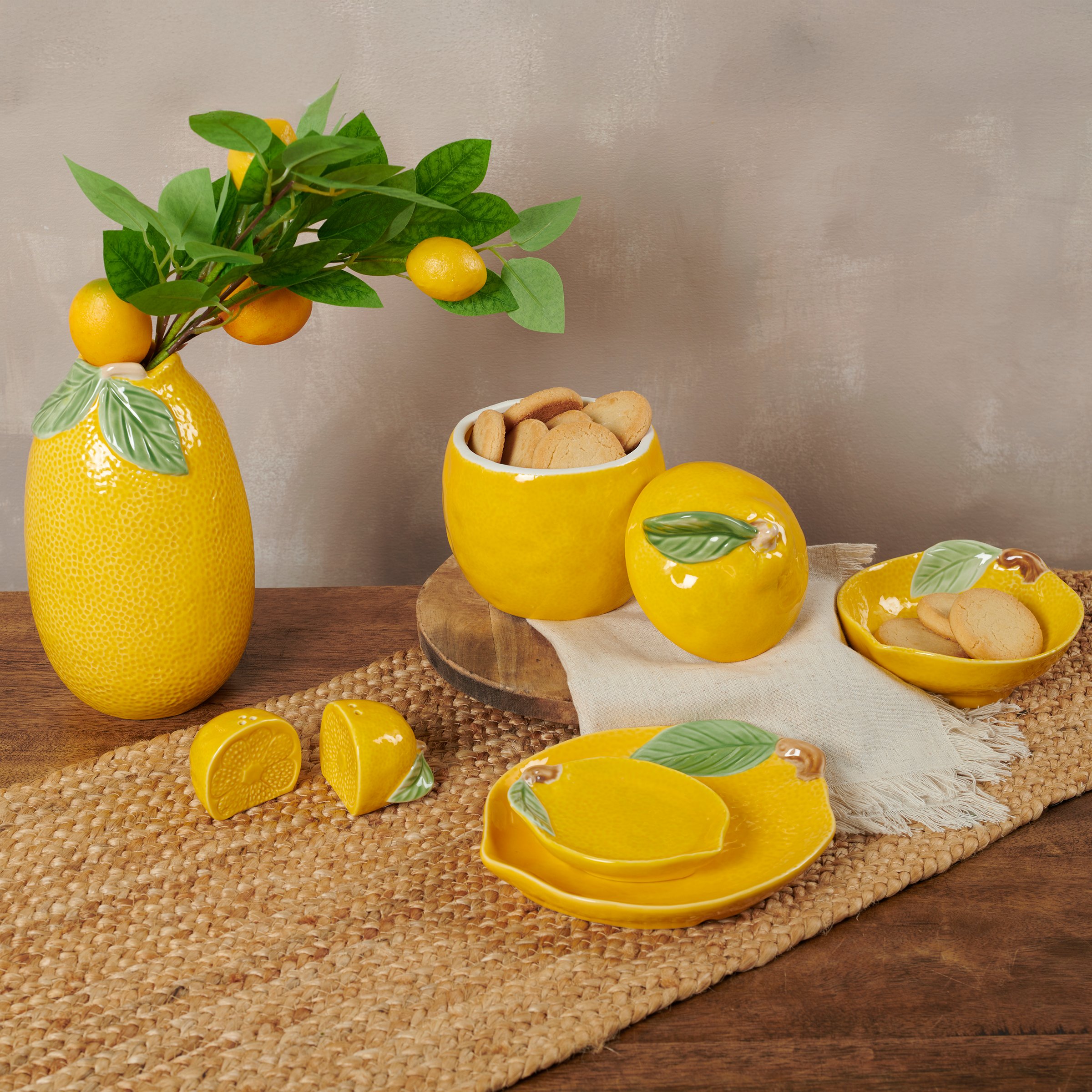 A small stoneware plate from our Garden Collection displaying a lemon inspired design with a textured glaze finish and sculpted leaf details to resemble the features of a lemon. Our small Lemon plate is conveniently microwave, oven, dishwasher, and food safe for easy use. A piece of fun dishware perfect for lemon-themed tablescapes.