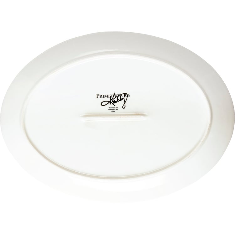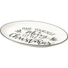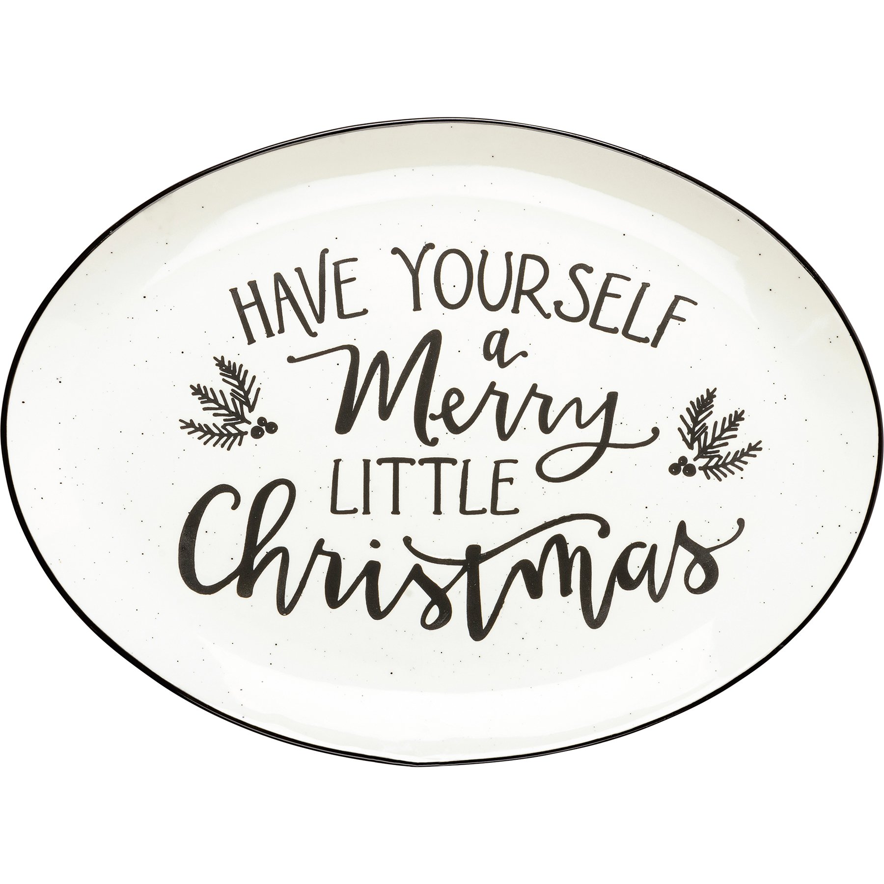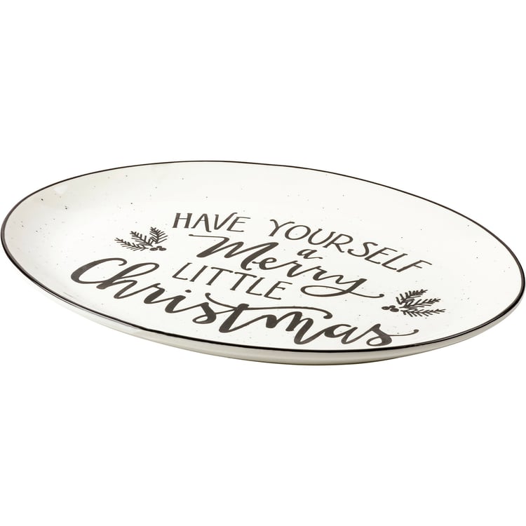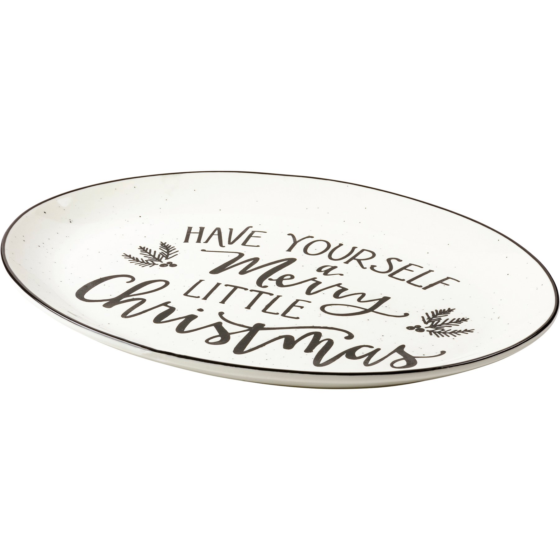 A stoneware oval platter featuring evergreen branch designs with "Have Yourself A Merry Little Christmas" sentiment. Debossed patterns add texture and dimension to designs. Microwave, dishwasher, and food safe.