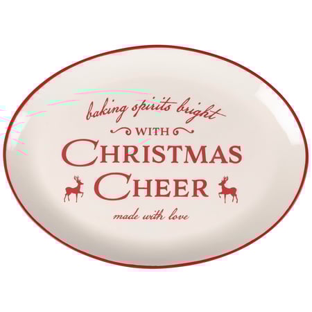 A durable stoneware platter from our Christmas Collection displaying a holiday white and red design with a fun Christmas baking themed sentiment that reads "Baking Spirits Bright With Christmas Cheer - Made With Love." Seasonal platter also features red border and debossed details. Our Christmas Cheer platter is conveniently microwave, dishwasher, and food safe for easy use. A fun piece of Christmas tableware perfect for seasonal gatherings or gifting.