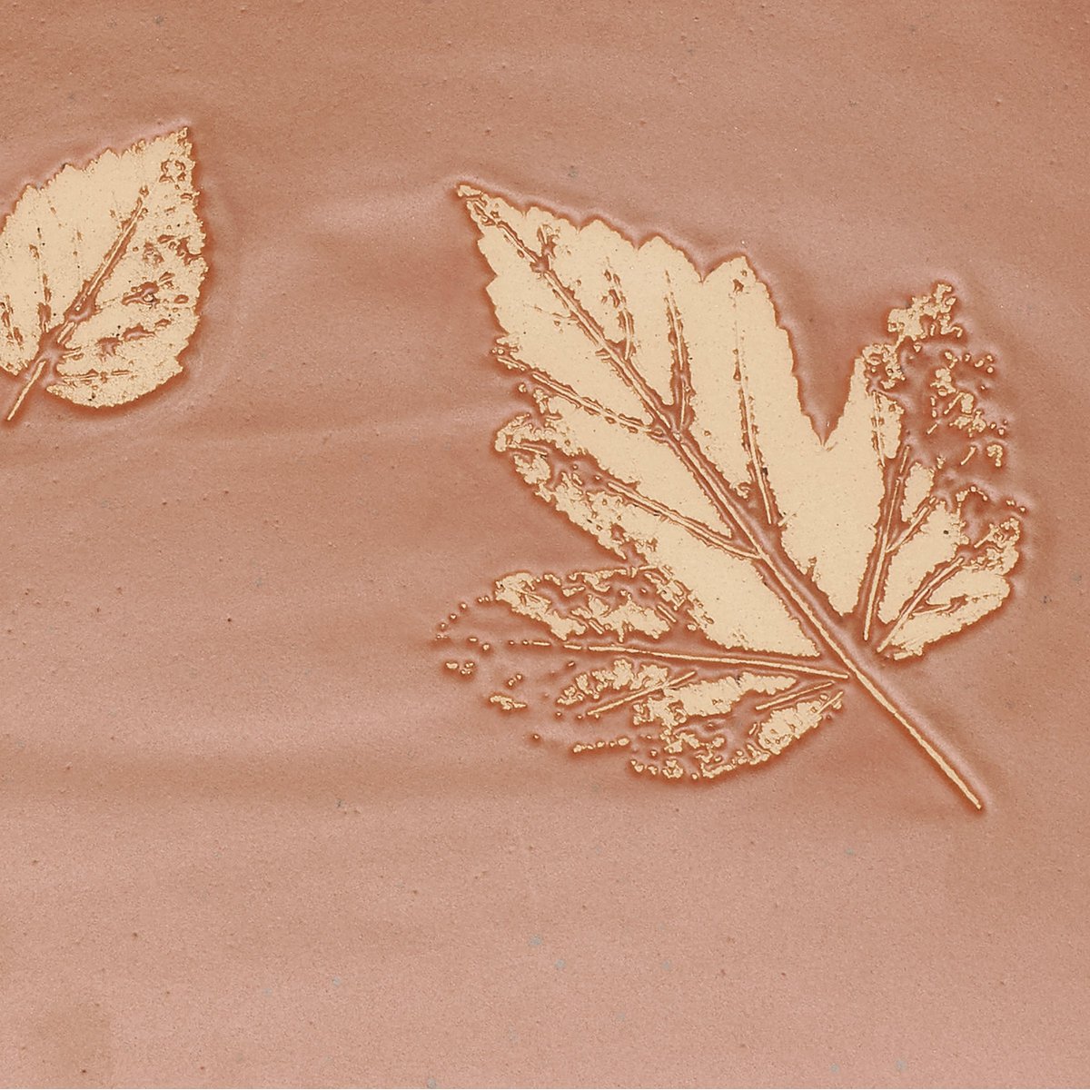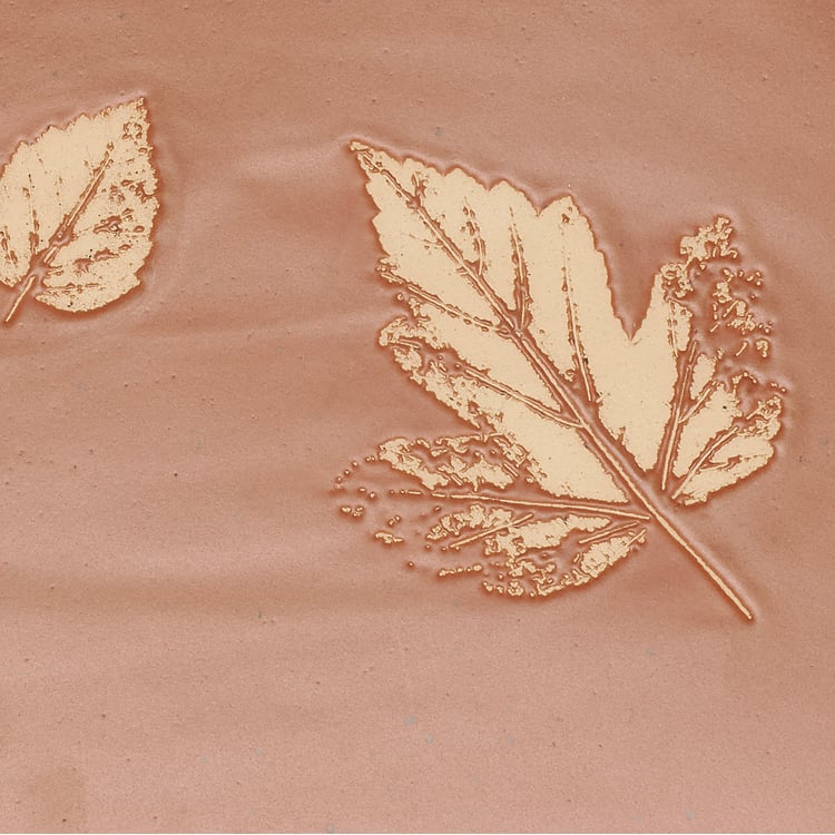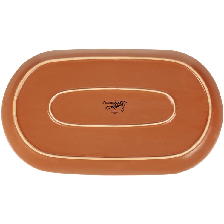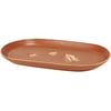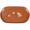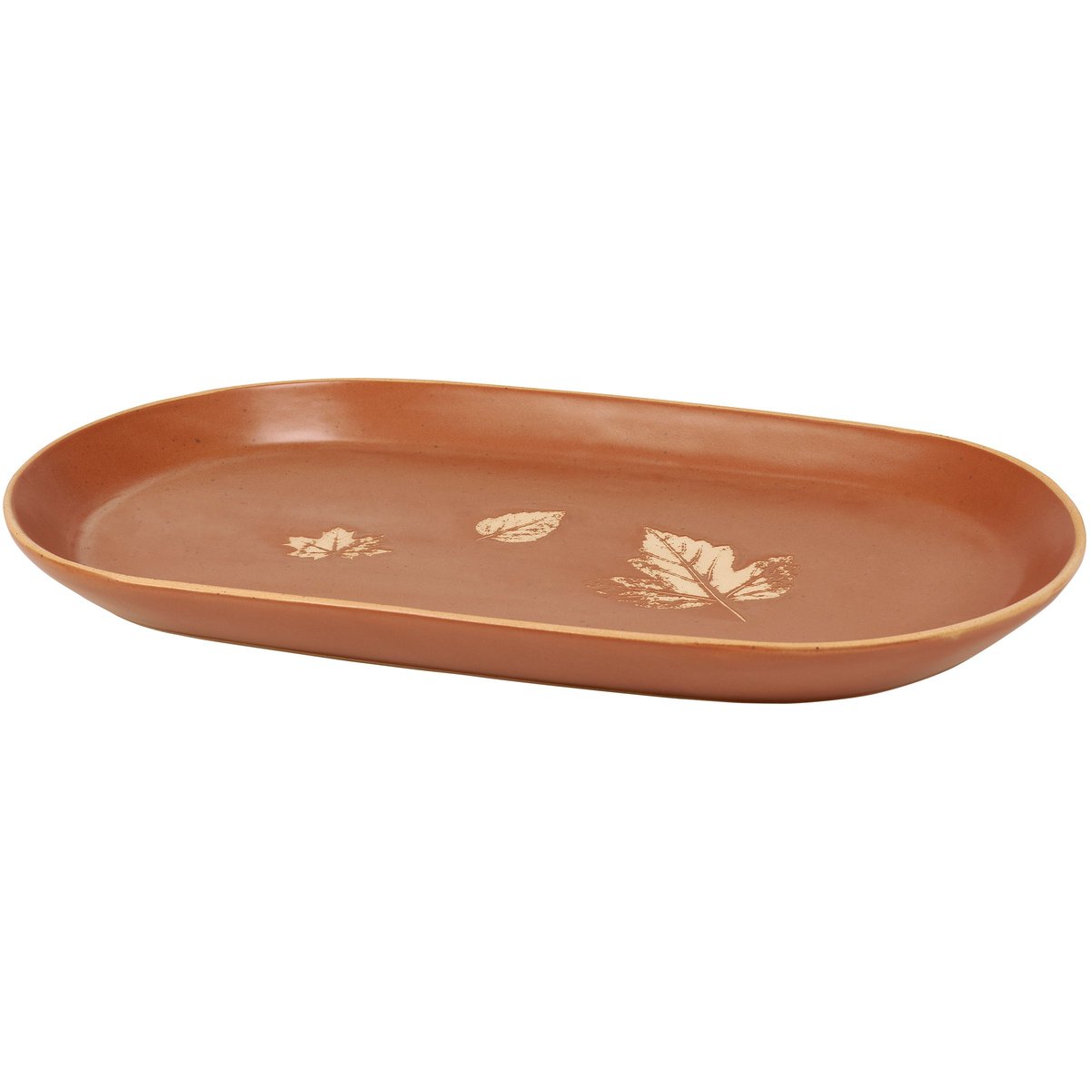 An oval stoneware platter from our Fall & Harvest Collection displaying an autumn brown color with three debossed cream fall leaf designs in the center. Platter features bare ceramic along the rim. Our Fall Leaves oval platter is microwave, dishwasher, and food safe for convenient use. A piece of rustic tableware perfect for seasonal gatherings.