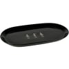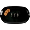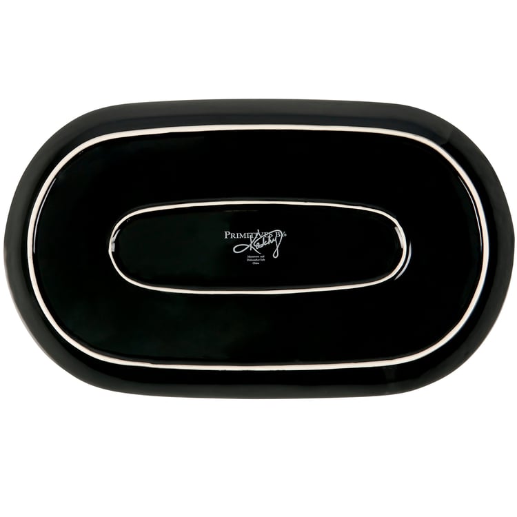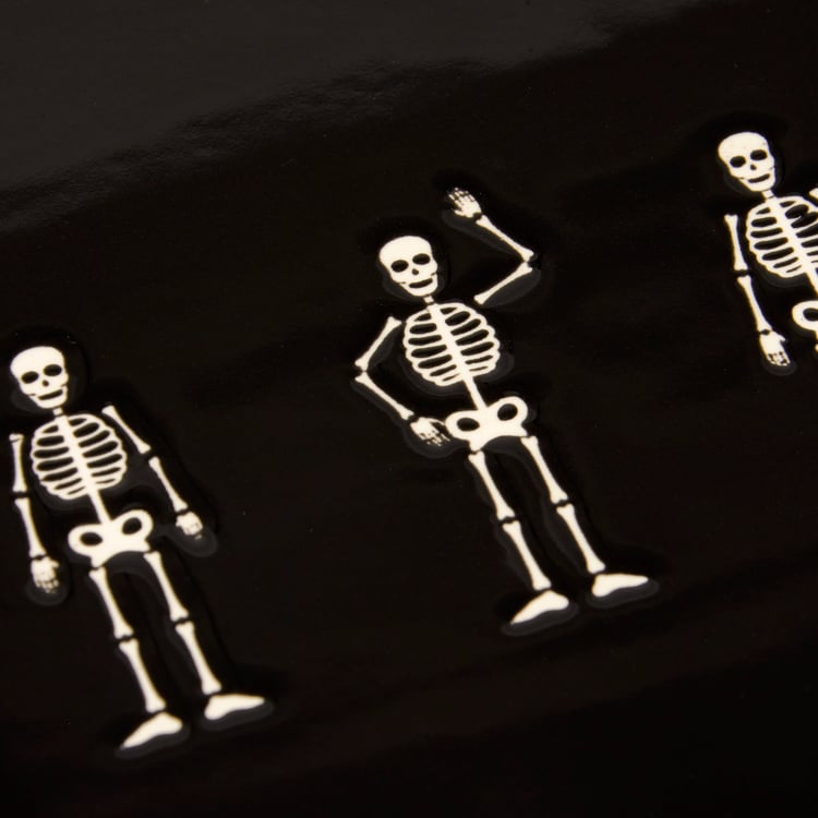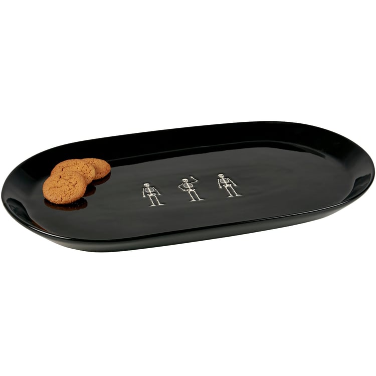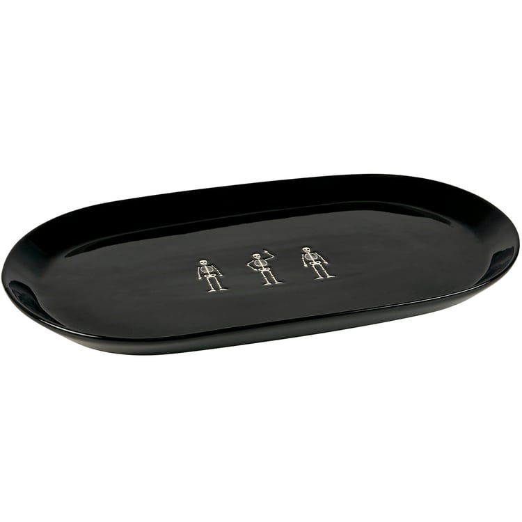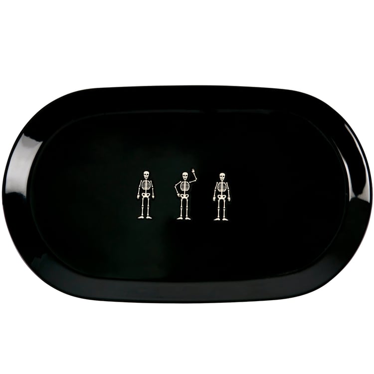 A stoneware platter from our Halloween Collection displaying a glossy black finish with three debossed white skeleton designs in the center. Our Skeletons platter is microwave, dishwasher, and food safe for convenient use. A piece of fun tableware perfect for seasonal gatherings.