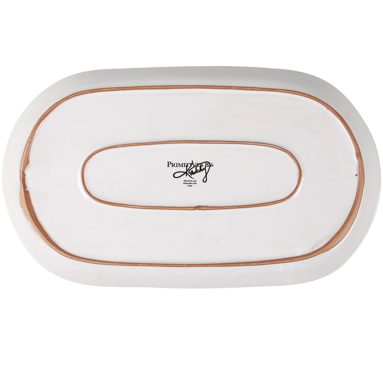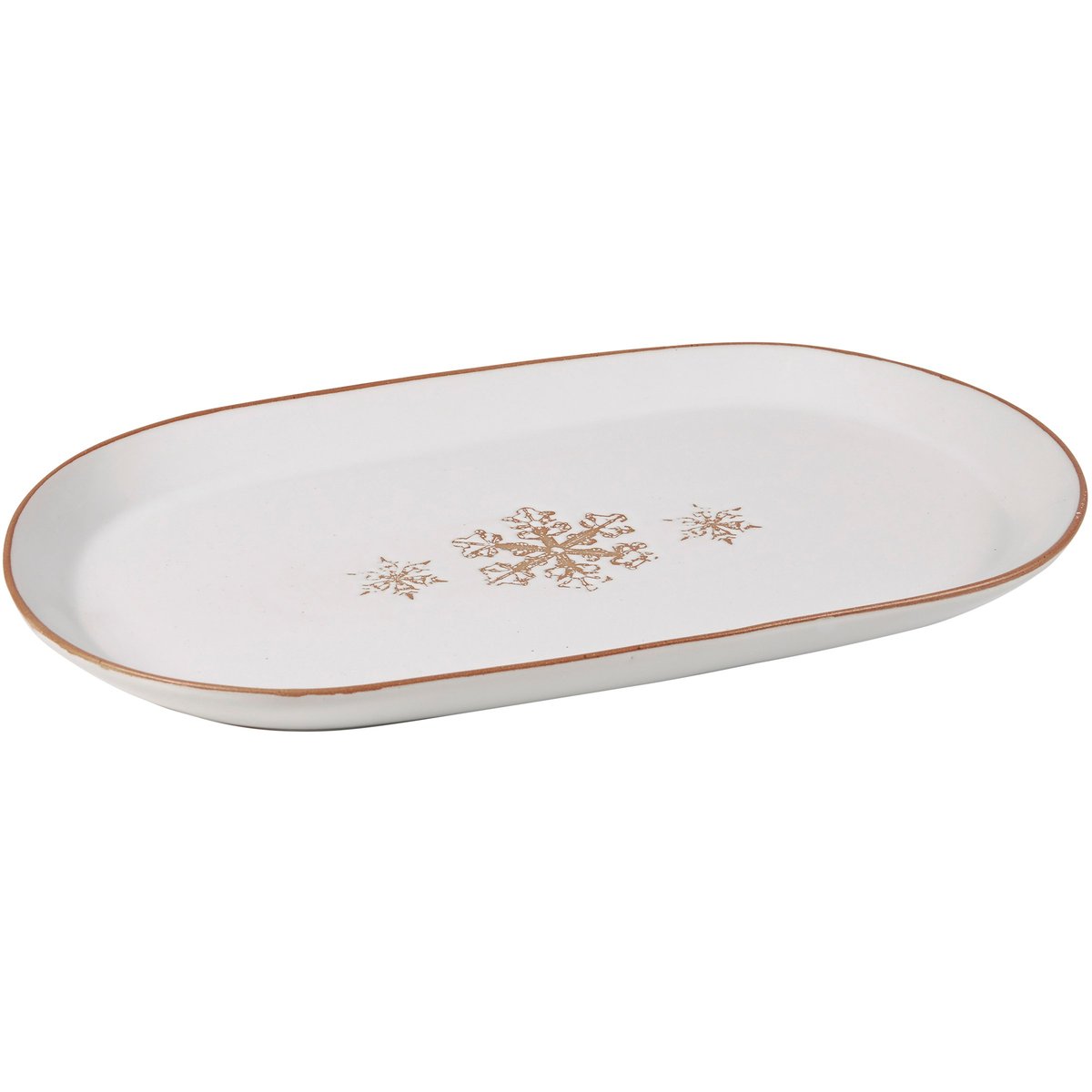 An oval stoneware platter from our Christmas Collection displaying a snowy cream color with three debossed brown snowflake designs in the center. Platter features bare ceramic along the rim. Our Snowflake oval platter is microwave, dishwasher, and food safe for convenient use. A piece of rustic tableware perfect for seasonal gatherings.