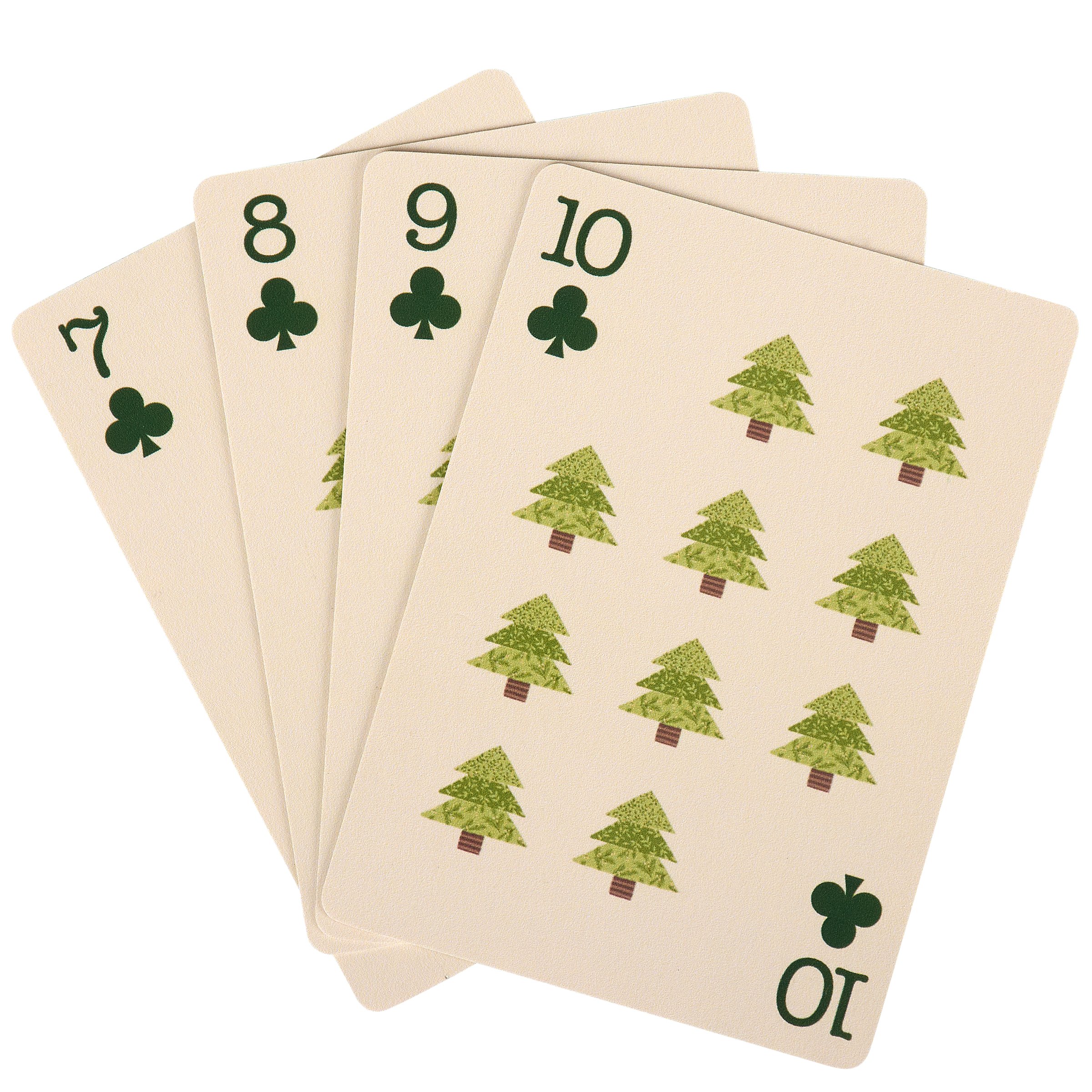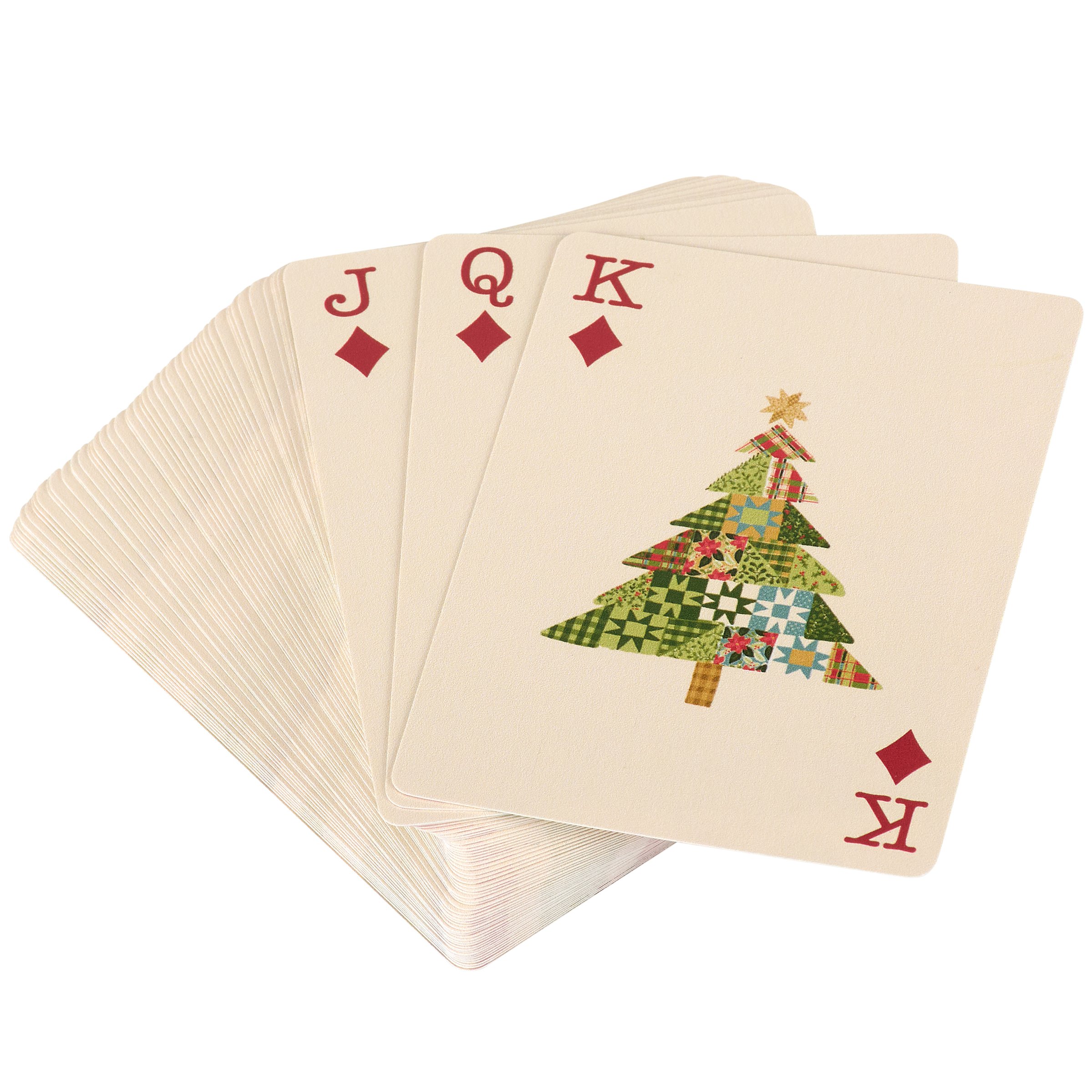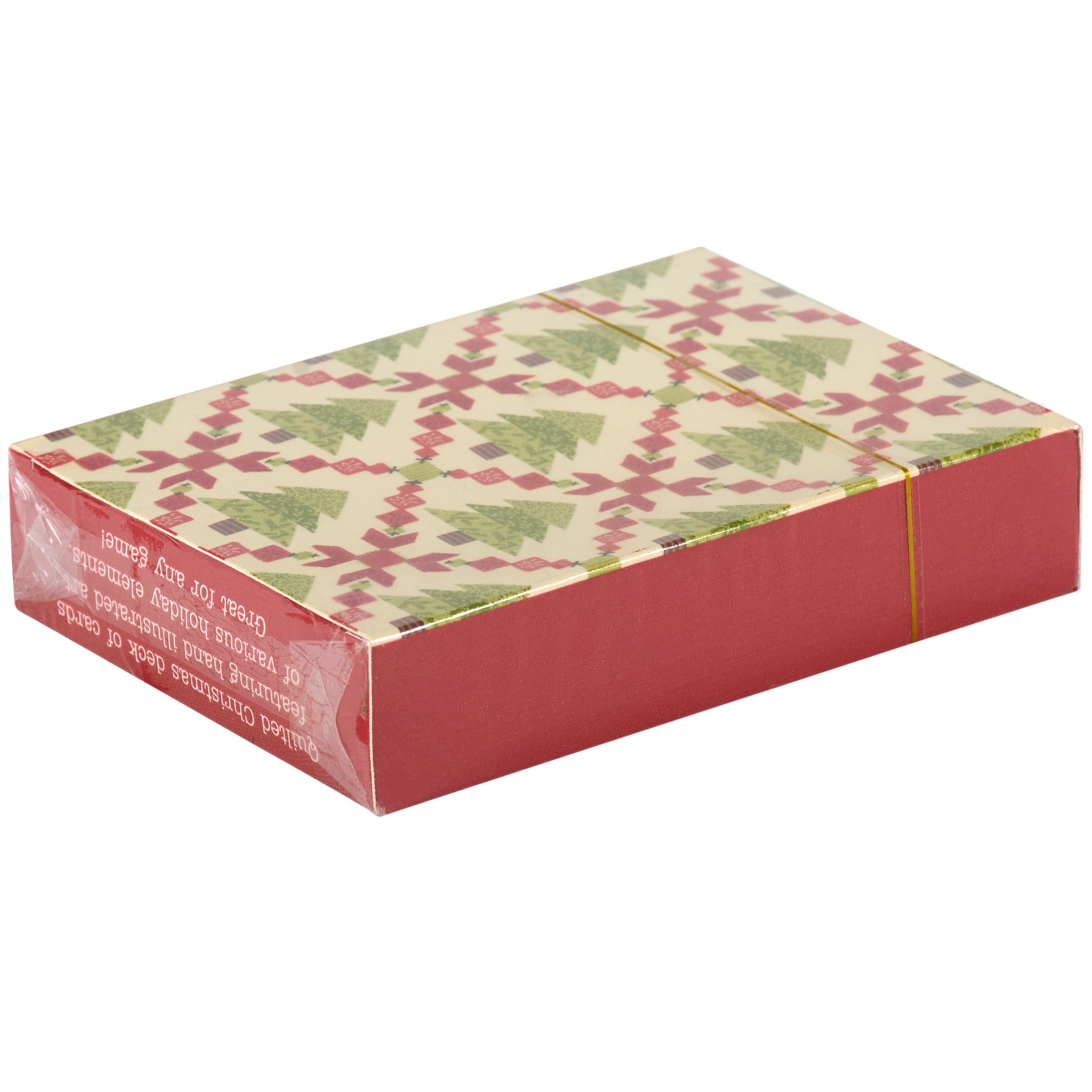 A 54-card playing deck from our Christmas Collection displaying craft inspired Christmas tree quilt patterns on the back of each card. The face of each card features coordinating Christmas tree designs. Each Christmas quilt design is replicated from original art hand painted in a unique watercolor style. Our Christmas Quilts playing cards are packaged in a protective carboard box displaying the full card art for easy storage when not in use or traveling. A craft themed Christmas gift perfect for on the go games.