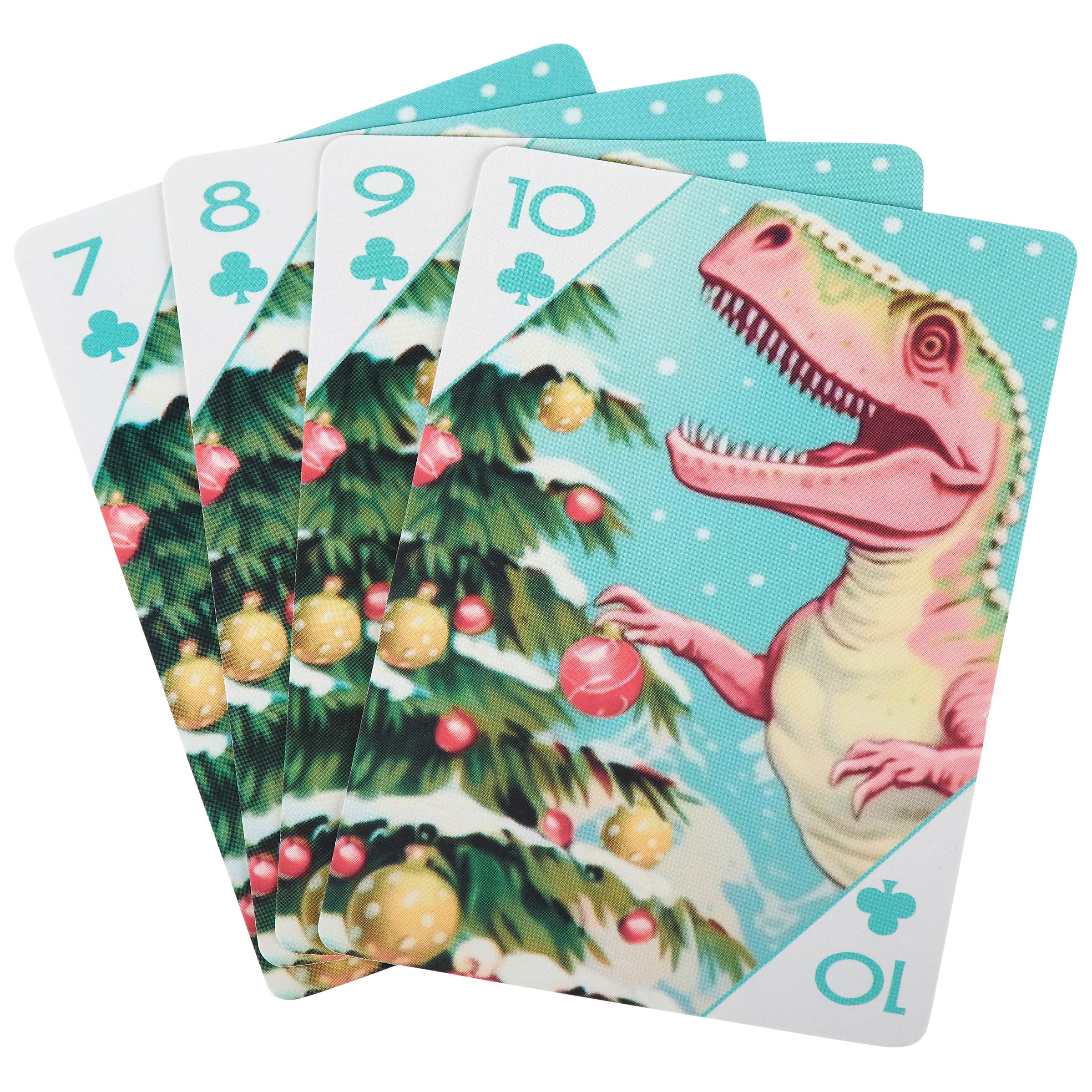 A 54-card playing deck from our Christmas Collection displaying fun retro art of dinosaurs celebrating Christmas on each card in a pastel color palette. Our Dino Christmas playing cards are packaged in a protective acrylic case for easy storage when not in use or traveling. A fun dino-themed Christmas gift perfect for on the go games.