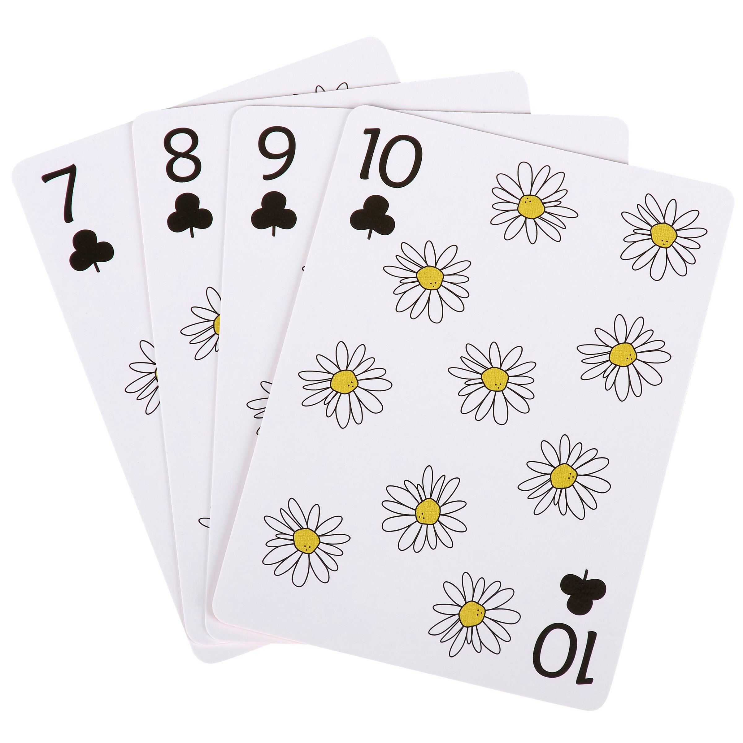 A 54-card playing deck from our Hand Illustrated Collection displaying unique hand illustrations of daisies and bees on each card. The back of each card features standing daisies and bees with fun daisy-themed sentiment that reads "Hello Sunshine." Our Hello Sunshine playing cards are packaged in a protective acrylic case for easy storage when not in use or traveling. A fun daisy-themed accessory perfect for gifting and on the go games.