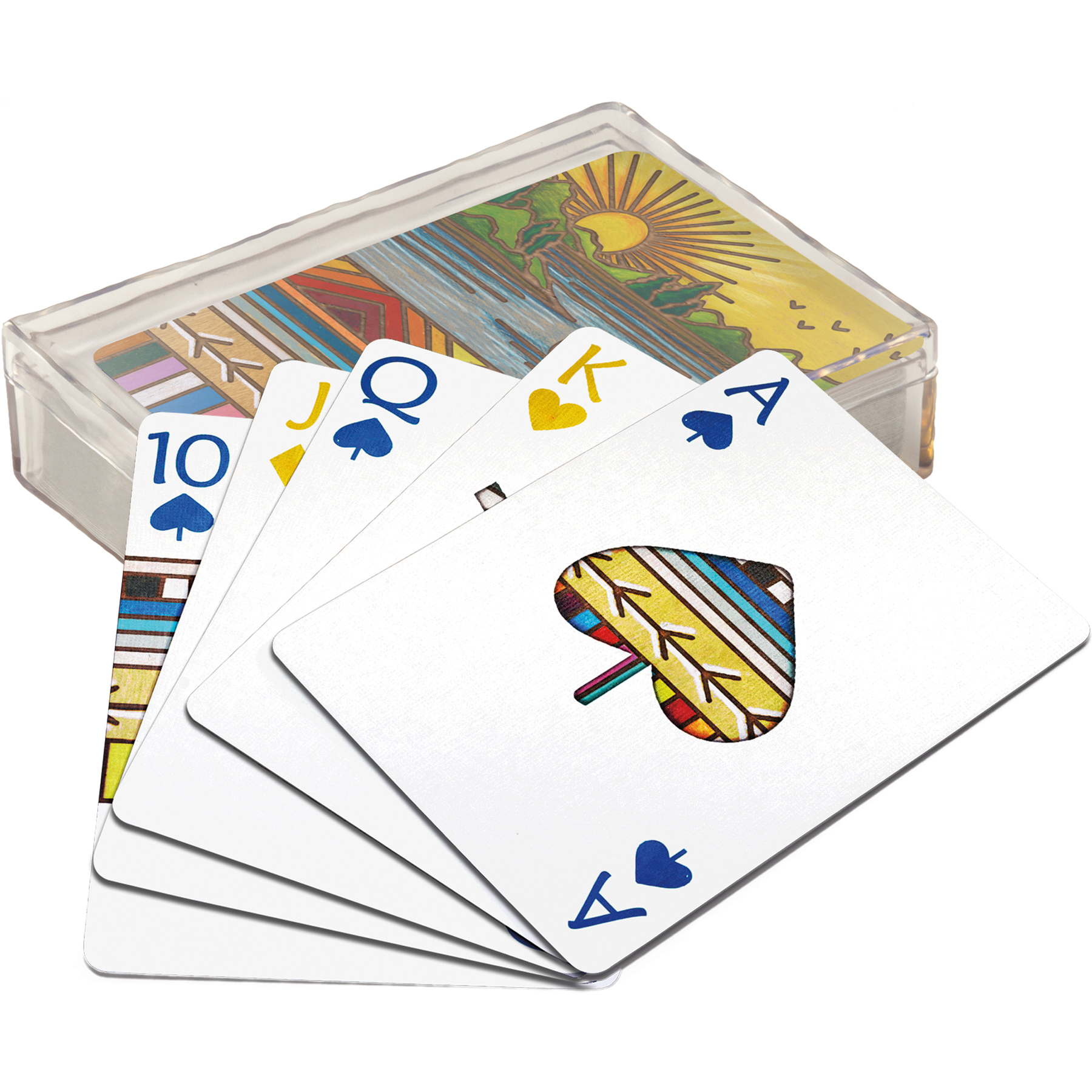 A 54-card playing deck featuring a variety of colorful wood burned designs with a lake theme. Our Lake playing cards are packaged in a protective acrylic case.
