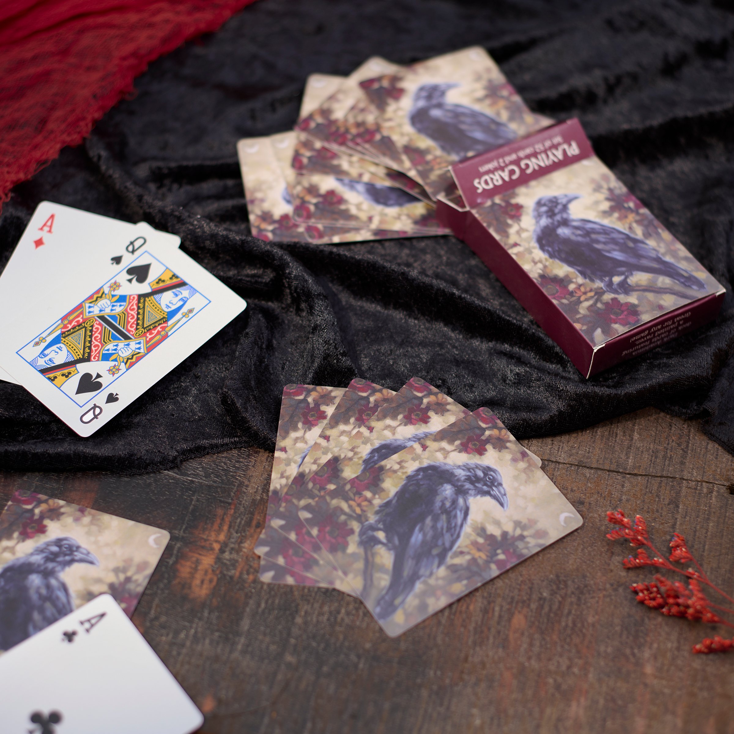 A 54-card playing deck from our Dark Academia Collection displaying a moody raven at night design in a hand painted style on the back of each card. Our Night Raven playing cards are packaged in a protective carboard box case displaying the full art for easy storage when not in use or traveling. A stylish accessory perfect for gifting and on the go games.