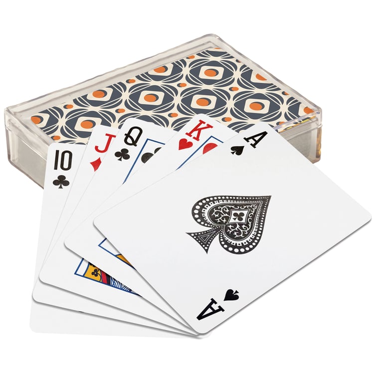 Distract friends from what you're holding in your hand with unique eye-catching patterns on infinitely usable playing cards. This stylish 54-card playing deck displays a bold retro inspired tile pattern on the back of each card for a nostalgic take on standard playing cards. Questionables playing cards are packaged in a protective acrylic case for easy storage when not in use or traveling. Our Retro Tiles playing cards are designed to call back to a retro style when hanging out with friends and family making them perfect for gifting or on-the-go boredom.