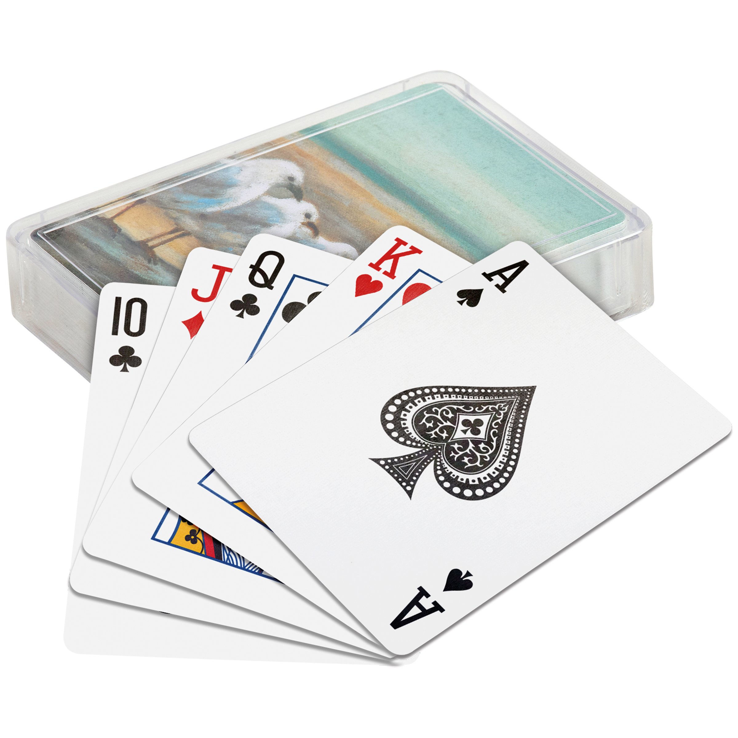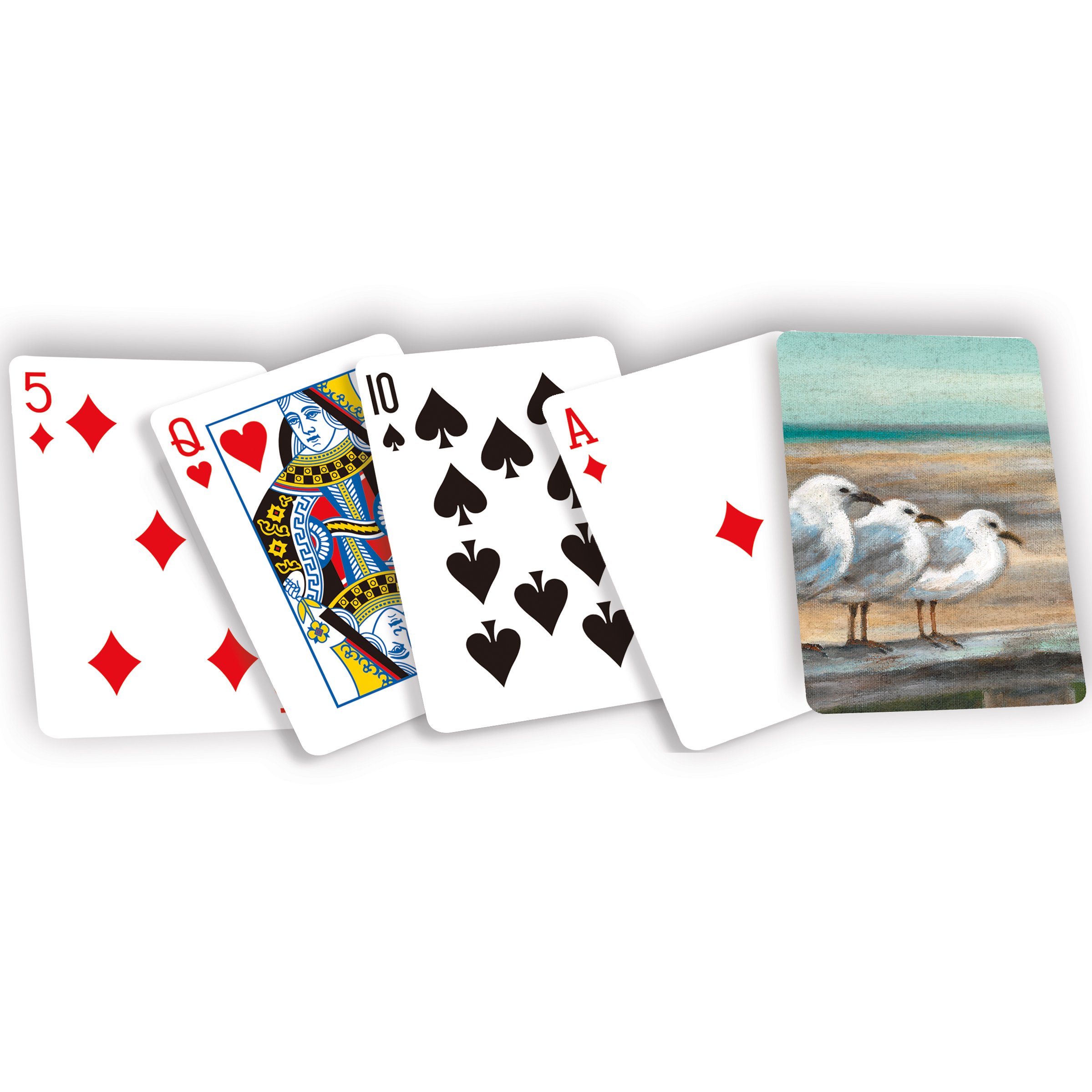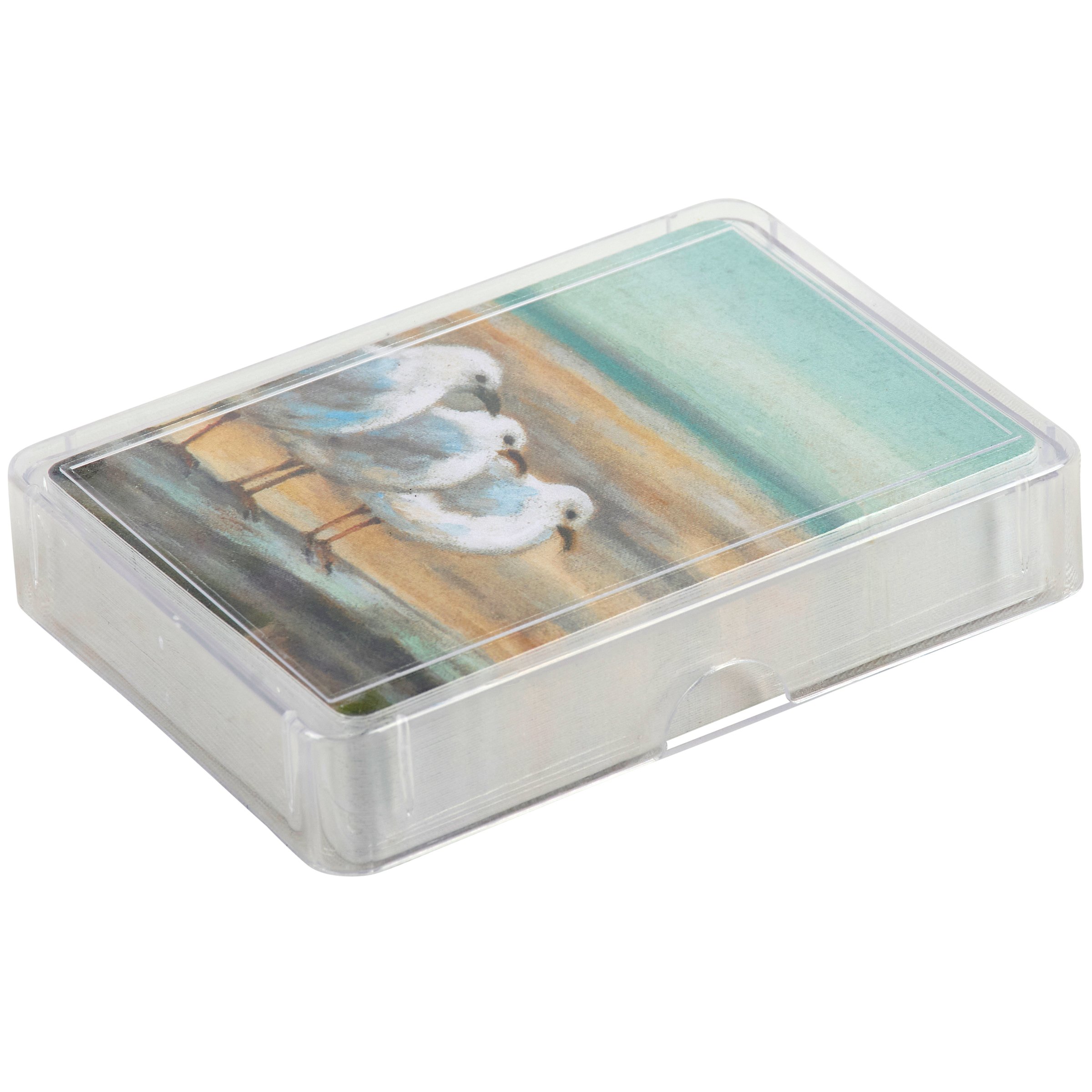 A 54-card playing deck from our Beach Collection displaying a beach scene of seagulls on the back of each card. Beach seagulls design is replicated from original artwork painted onto burlap canvas, giving the art a unique depth and texture. Our Seagulls playing cards are packaged in a protective acrylic case for easy storage when not in use or traveling. A fun beach themed gift perfect for on the go games.