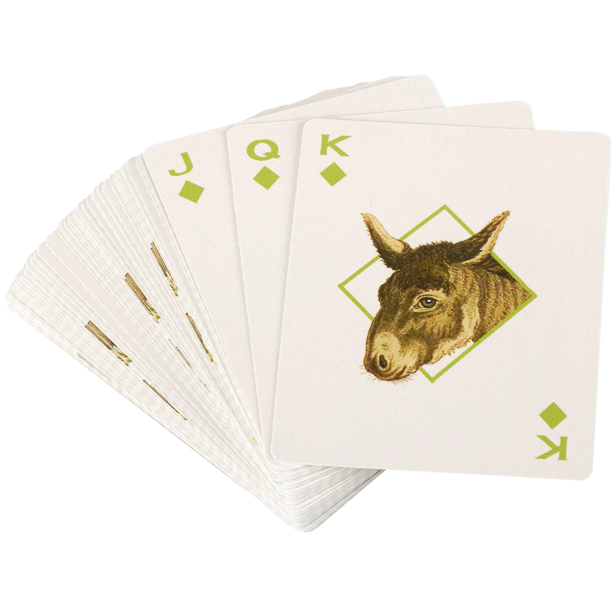 A 54-card playing deck from our Farmhouse Collection displaying vintage art of a donkey with fun farm pun that reads "That's An Ass-Kickin' Hand" on the back of each card. The face of each card features coordinating vintage art of donkeys. Our That's An Ass-Kickin' Hand playing cards are packaged in a protective carboard box displaying the full card art for easy storage when not in use or traveling. A fun farm themed gift perfect for on the go games.