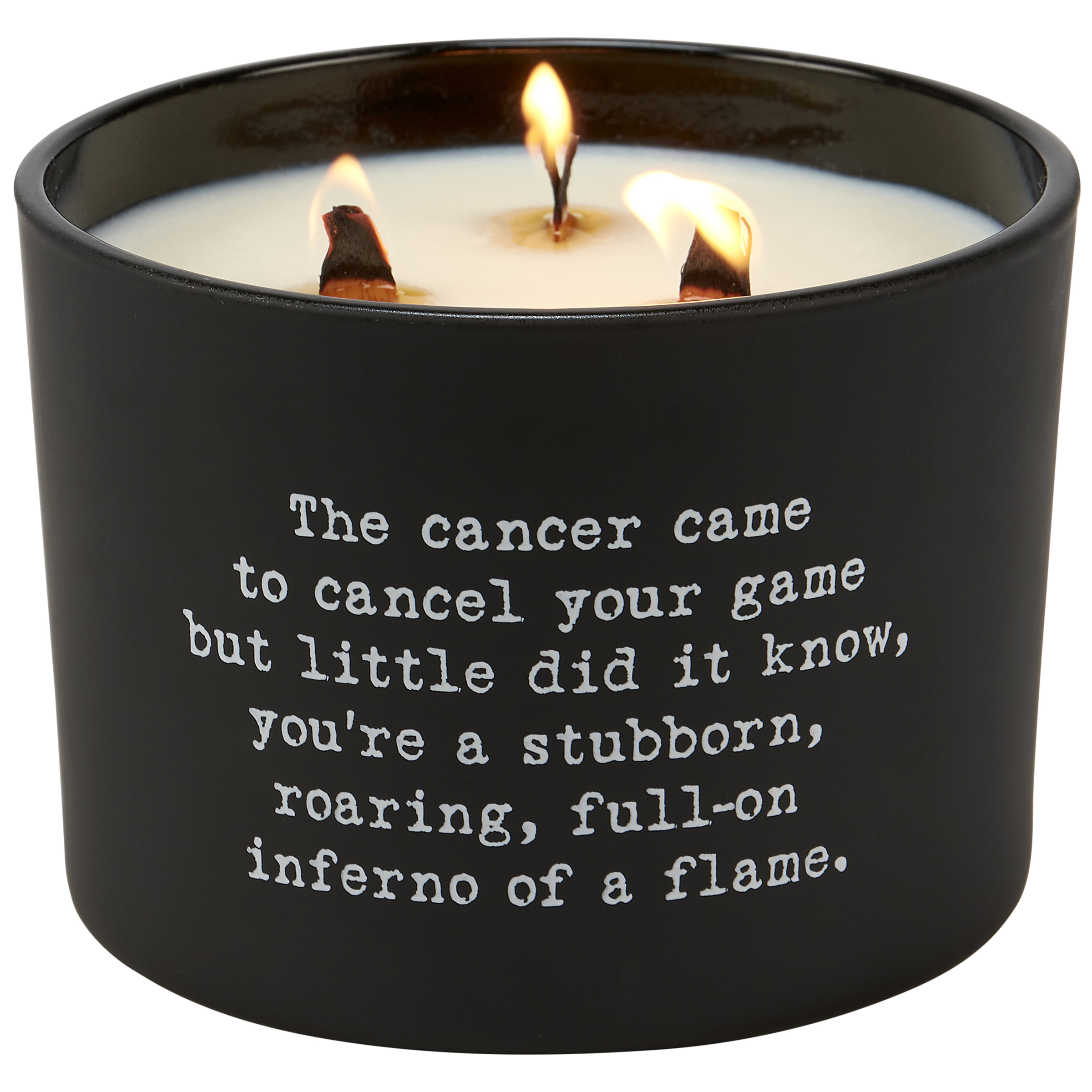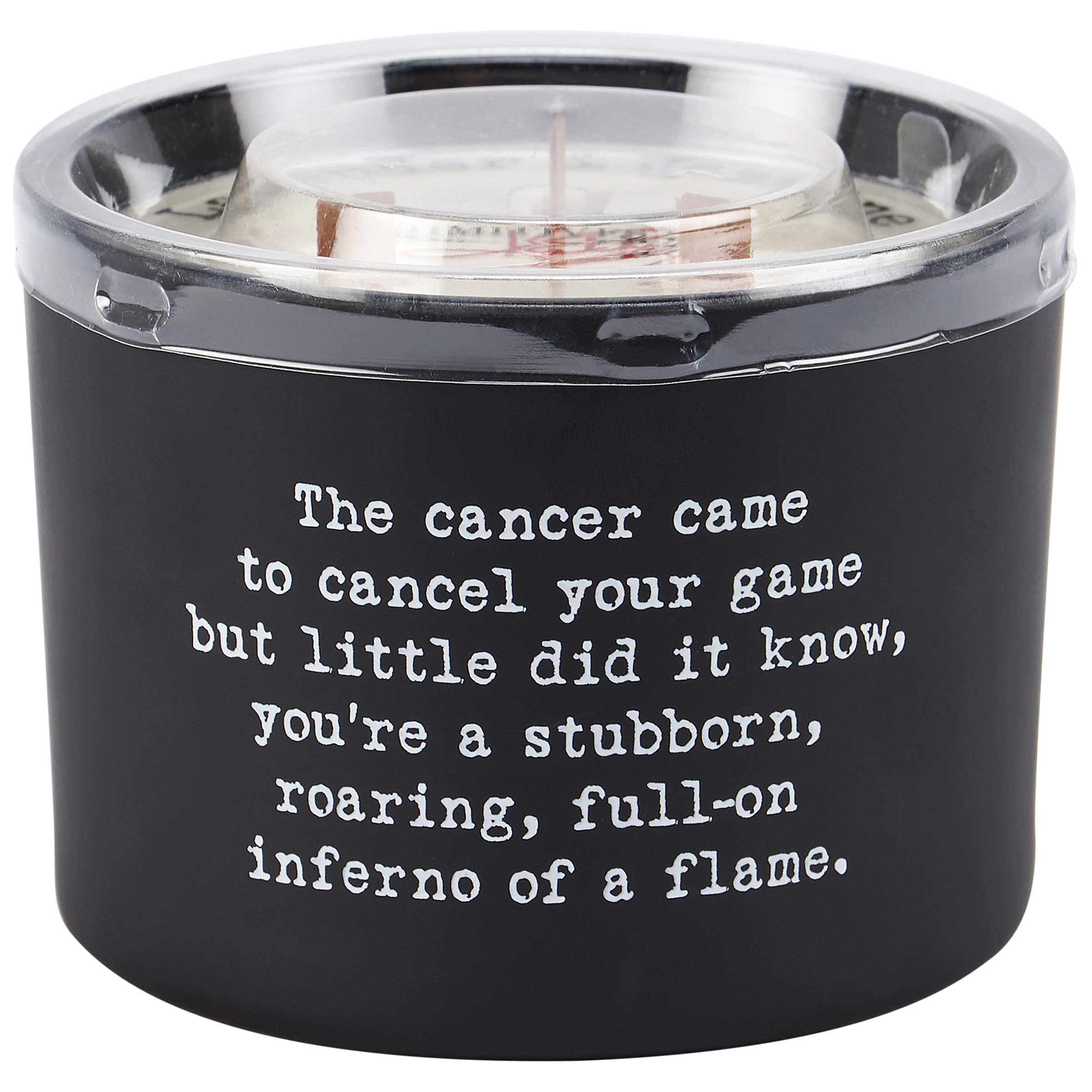 A candle from our Box Sign Style Collection displaying an inspirational cancer-themed poem in a typewriter style on matte black glass that reads "The cancer came to cancel your game but little did it know, you're a stubborn, roaring, full-on inferno of a flame." Poetry candle features soy-based wax and 3 wooden wicks with 26 hours of burn time activating a calming Lavender & Jasmine scent. Our Cancer poetry candle includes a dust cover and plastic lid for protection and enhanced appearance on store displays. An inspirational gift perfect for an everyday home accent.