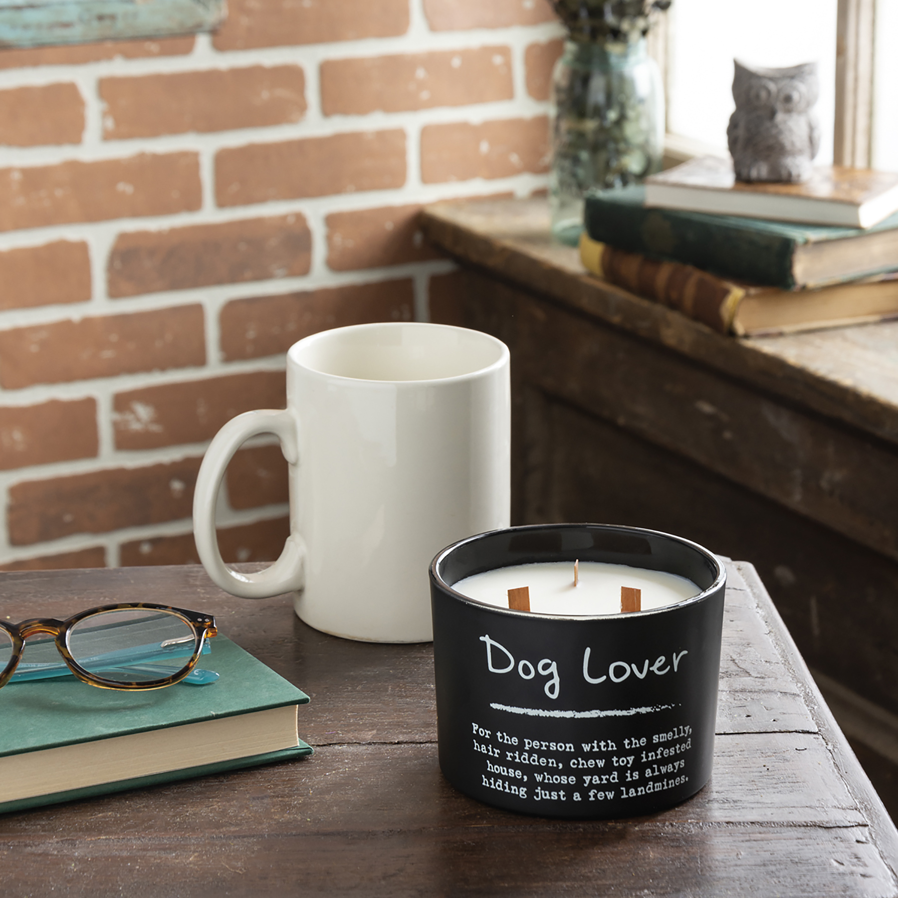 A matte black glass vessel holds this soy-based wax candle which features a refreshing sea salt & sage scent and "Dog Lover For The Person With The Smelly, Hair Ridden, Chew Toy Infested House, Whose Yard Is Always Hiding Just A Few Land Mines." sentiment. The smart sentiment on the front makes this item a perfect and easy gift that feels tailor-made for the dog lovers in your life. Our Dog Lover candle contains three wooden wicks for a total of 26 hours of burn time. Includes a plastic wax cover for protection and a polished look. Part of our best-selling Pet Collection.