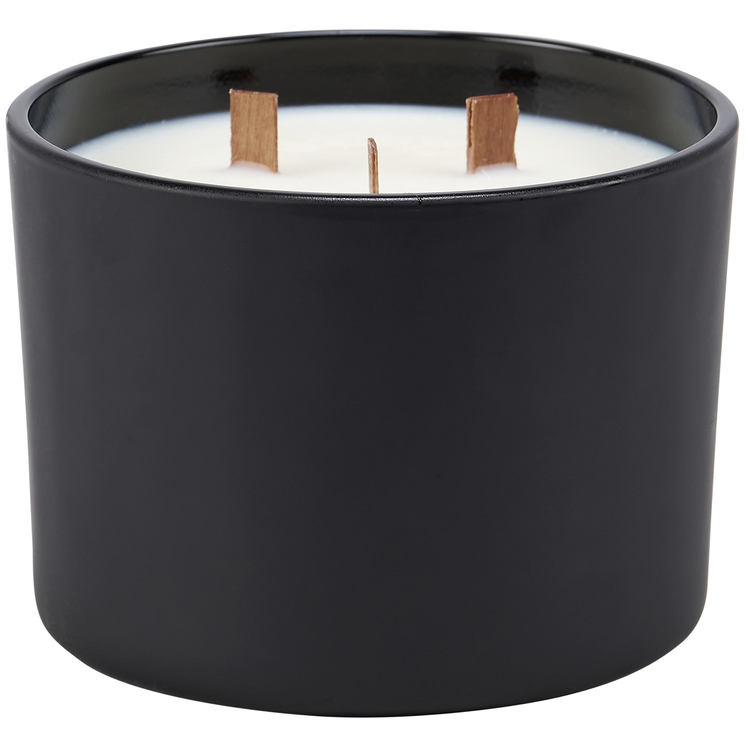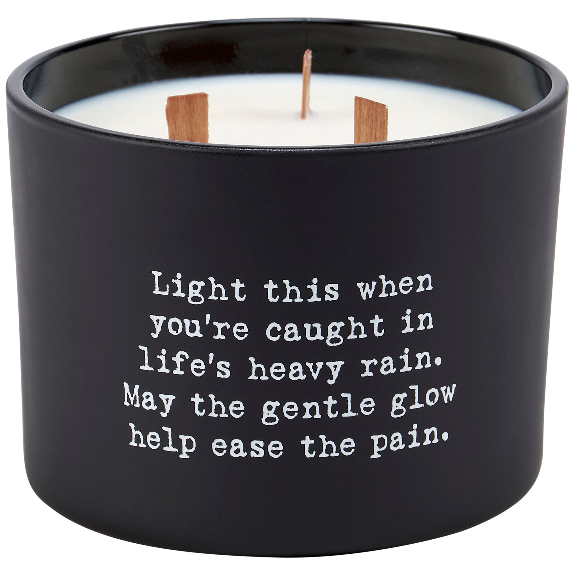 A candle from our Box Sign Style Collection displaying an inspirational poem in a typewriter style on matte black glass that reads "Light this when you're caught in life's heavy rain. May the gentle glow help ease the pain." Poetry candle features soy-based wax and 3 wooden wicks with 26 hours of burn time activating a calming Fresh Air scent. Our Ease The Pain poetry candle includes a dust cover and plastic lid for protection and enhanced appearance on store displays. An inspirational gift perfect for an everyday home accent.
