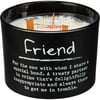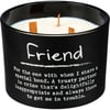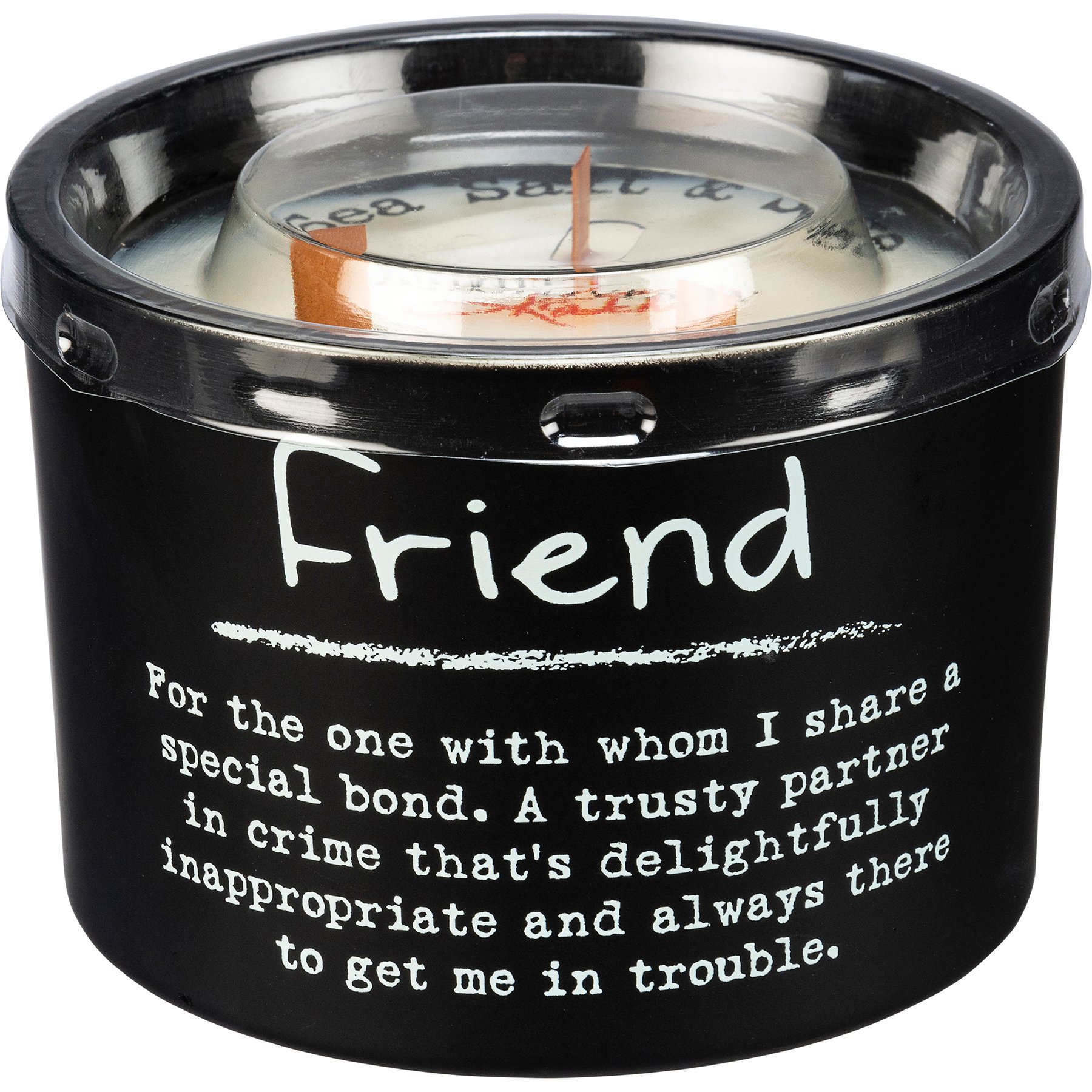 A matte black glass vessel holds this soy-based wax candle from our Poetry Collection which features a refreshing sea salt & sage scent and "Friend For The One With Whom I Share A Special Bond. A Trusty Partner In Crime That's Delightfully Inappropriate And Always There To Get Me In Trouble." sentiment. The smart sentiment on the front makes this item a perfect and easy gift that feels tailor-made for the friends in your life. This Friend candle contains three wooden wicks for a total of 26 hours of burn time. Includes a plastic wax cover for protection and a polished look.