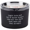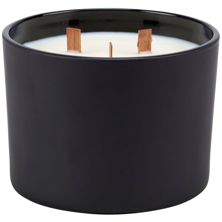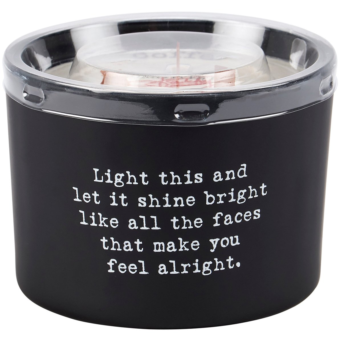 A candle from our Box Sign Style Collection displaying an inspirational friend inspired poem in a typewriter style on matte black glass that reads "Light this and let it shine bright like all the faces that make you feel alright." Poetry candle features soy-based wax and 3 wooden wicks with 26 hours of burn time activating a refreshing Coffee scent. Our Friends poetry candle includes a dust cover and plastic lid for protection and enhanced appearance on store displays. An inspirational gift perfect for an everyday home accent.