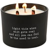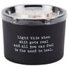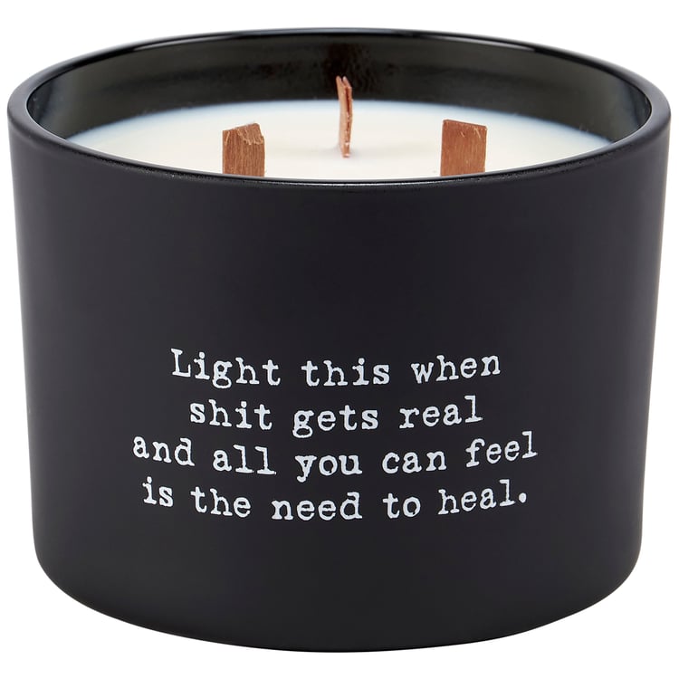 A candle from our Box Sign Style Collection displaying a fun inspirational poem in a typewriter style on matte black glass that reads "Light this when shit gets real and all you can feel is the need to heal." Poetry candle features soy-based wax and 3 wooden wicks with 26 hours of burn time activating a refreshing Coconut scent. Our Heal poetry candle includes a dust cover and plastic lid for protection and enhanced appearance on store displays. An inspirational gift perfect for an everyday home accent.