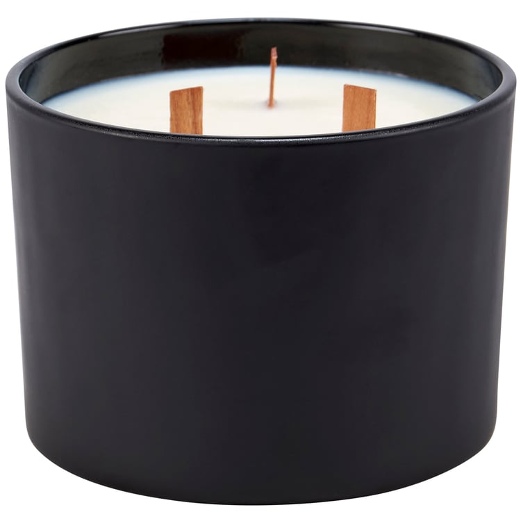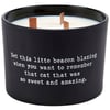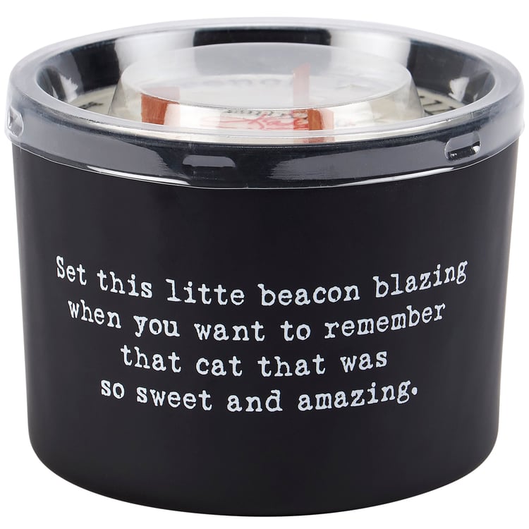 A candle from our Box Sign Style Collection displaying a bereavement inspired pet poem in a typewriter style on matte black glass that reads "Set this little beacon blazing when you want to remember that cat that was so sweet and amazing." Poetry candle features soy-based wax and 3 wooden wicks with 26 hours of burn time activating a calming French Vanilla scent. Our Sweet Cat poetry candle includes a dust cover and plastic lid for protection and enhanced appearance on store displays. A heartwarming pet-themed gift perfect for an everyday home accent.