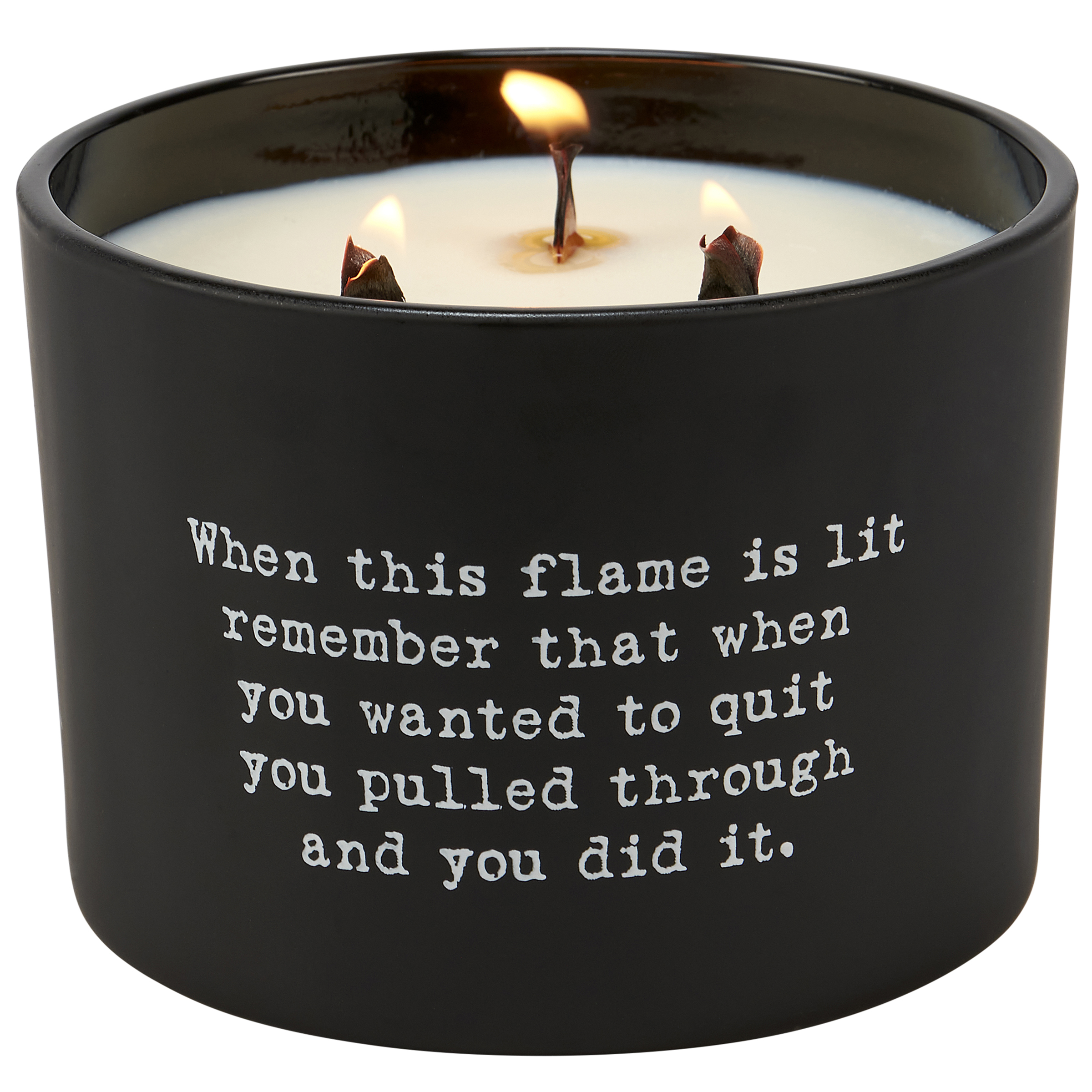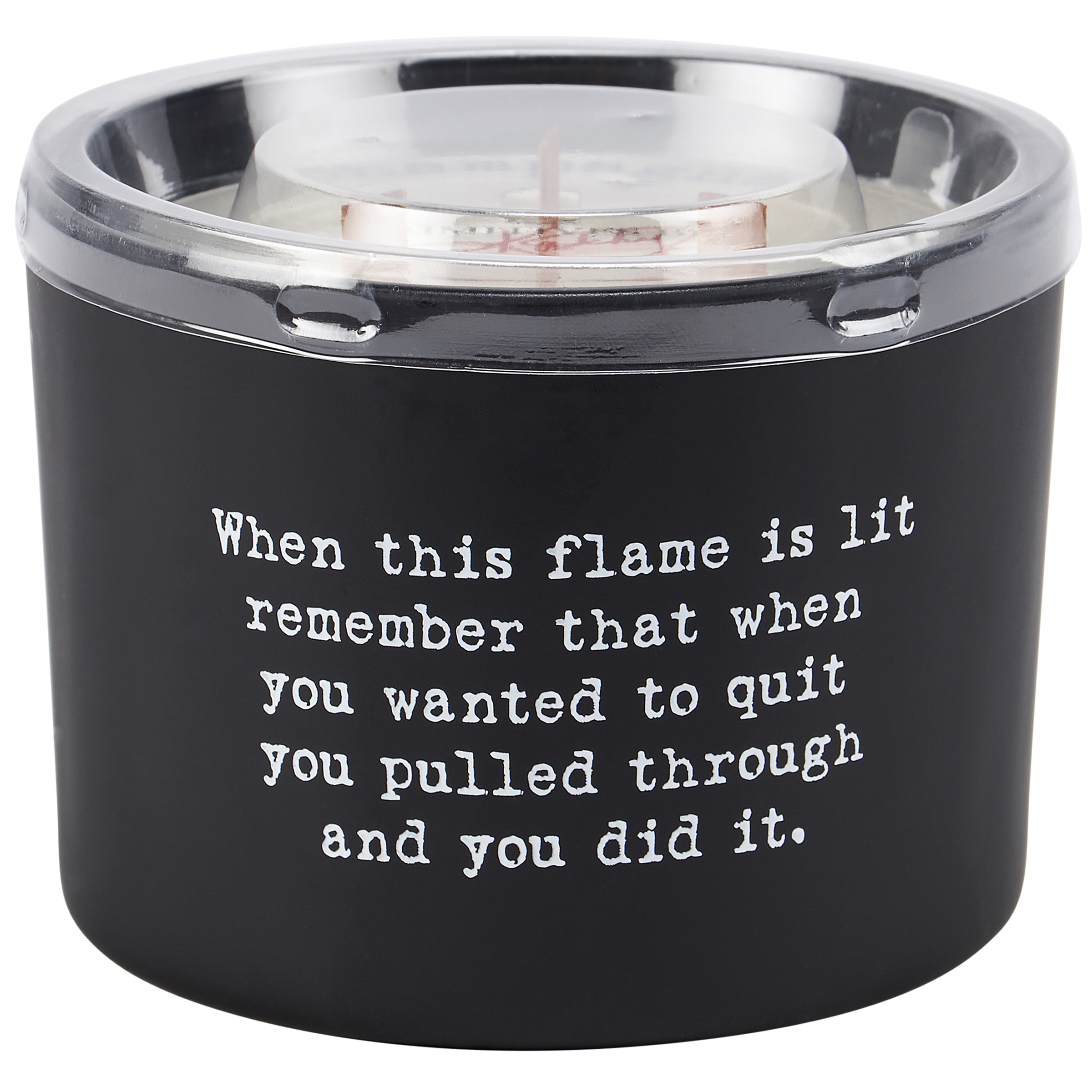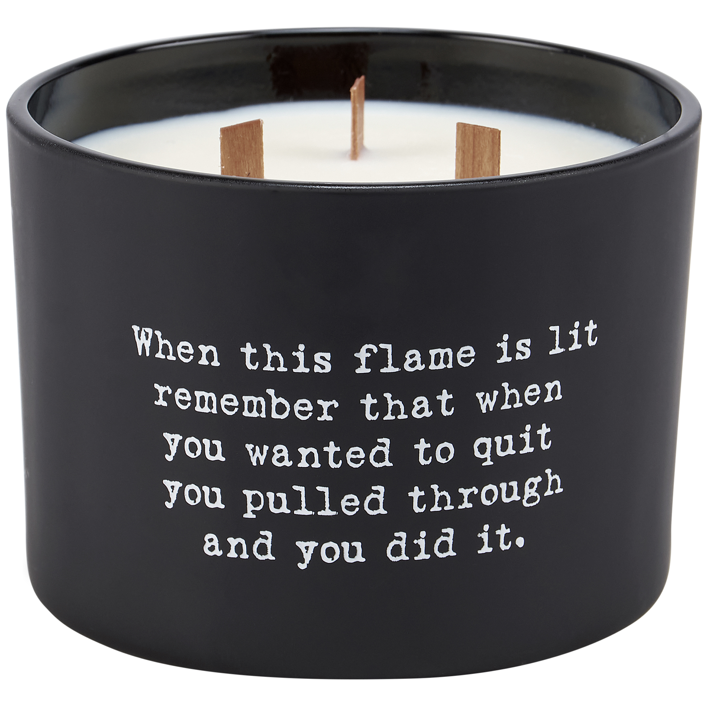A candle from our Box Sign Style Collection displaying a fun inspirational poem in a typewriter style on matte black glass that reads "When this flame is lit remember that when you wanted to quit you pulled through and you did it." Poetry candle features soy-based wax and 3 wooden wicks with 26 hours of burn time activating a refreshing Champagne scent. Our You Did It poetry candle includes a dust cover and plastic lid for protection and enhanced appearance on store displays. An inspirational gift perfect for an everyday home accent.