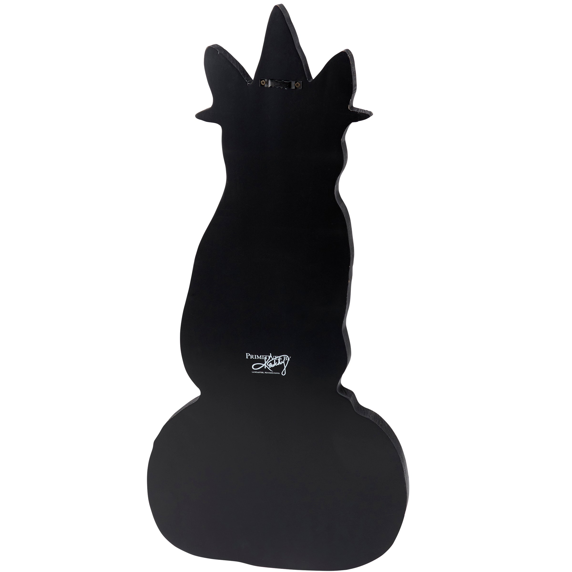 A wooden porch leaner from our Halloween Collection displaying a hand painted design of a black cat wearing a witch hat and sitting on a pumpkin. Design is replicated from original artwork painted onto burlap canvas, giving the art a unique depth and texture. Porch leaner is shaped to the painted design with coordinating black color on the sides and back. Our Black Cat porch leaner is easy to display and stands over 25 inches tall for a Halloween statement piece indoor or outdoor. Also includes a sawtooth hanger on the back for option to hang. A fun seasonal home décor piece with a variety of display options.