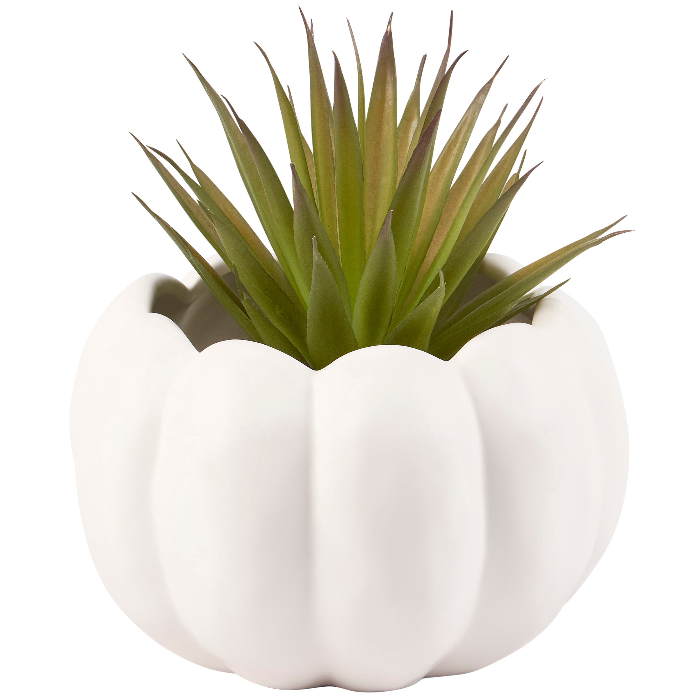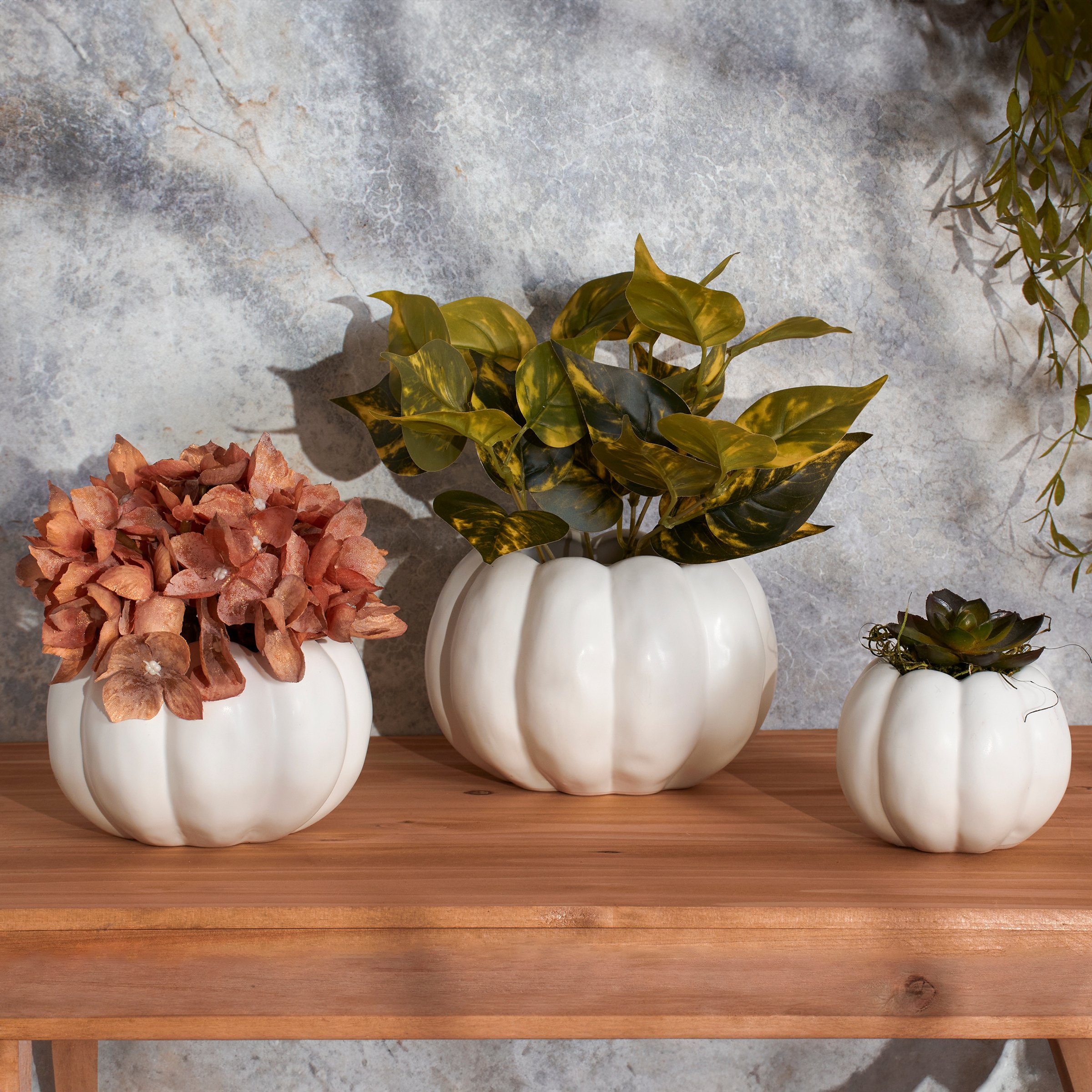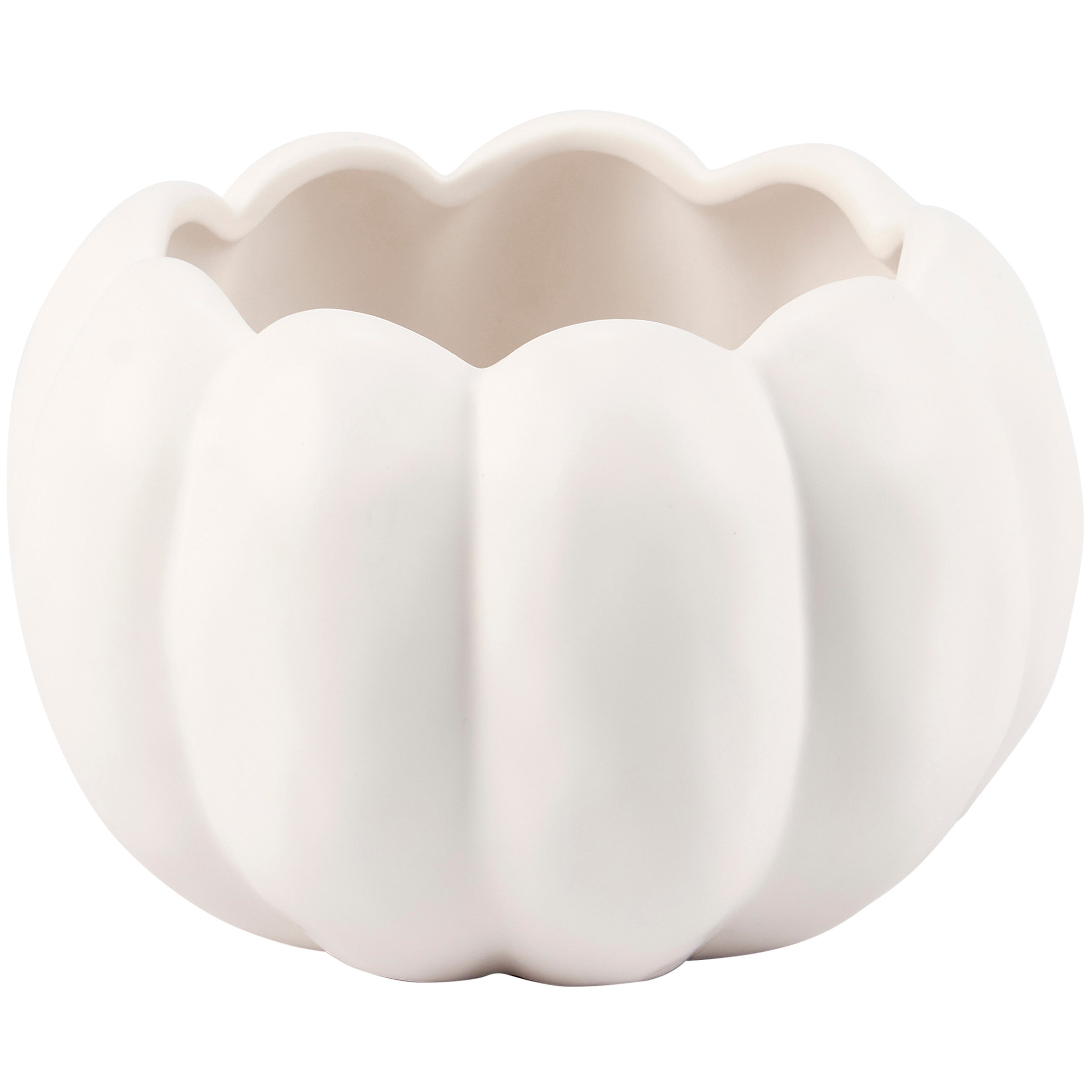 A medium ceramic pot from our Fall & Harvest Collection displaying a sculpted pumpkin shape and matte cream color finish. Our medium Pumpkin pot includes an opening on top to place seasonal florals, succulents, or décor. Greenery pictured not included. Seasonal pumpkin pot features a neutral color making it easy to coordinate with a variety of plants and décor. A pumpkin-themed home accent perfect for seasonal display.