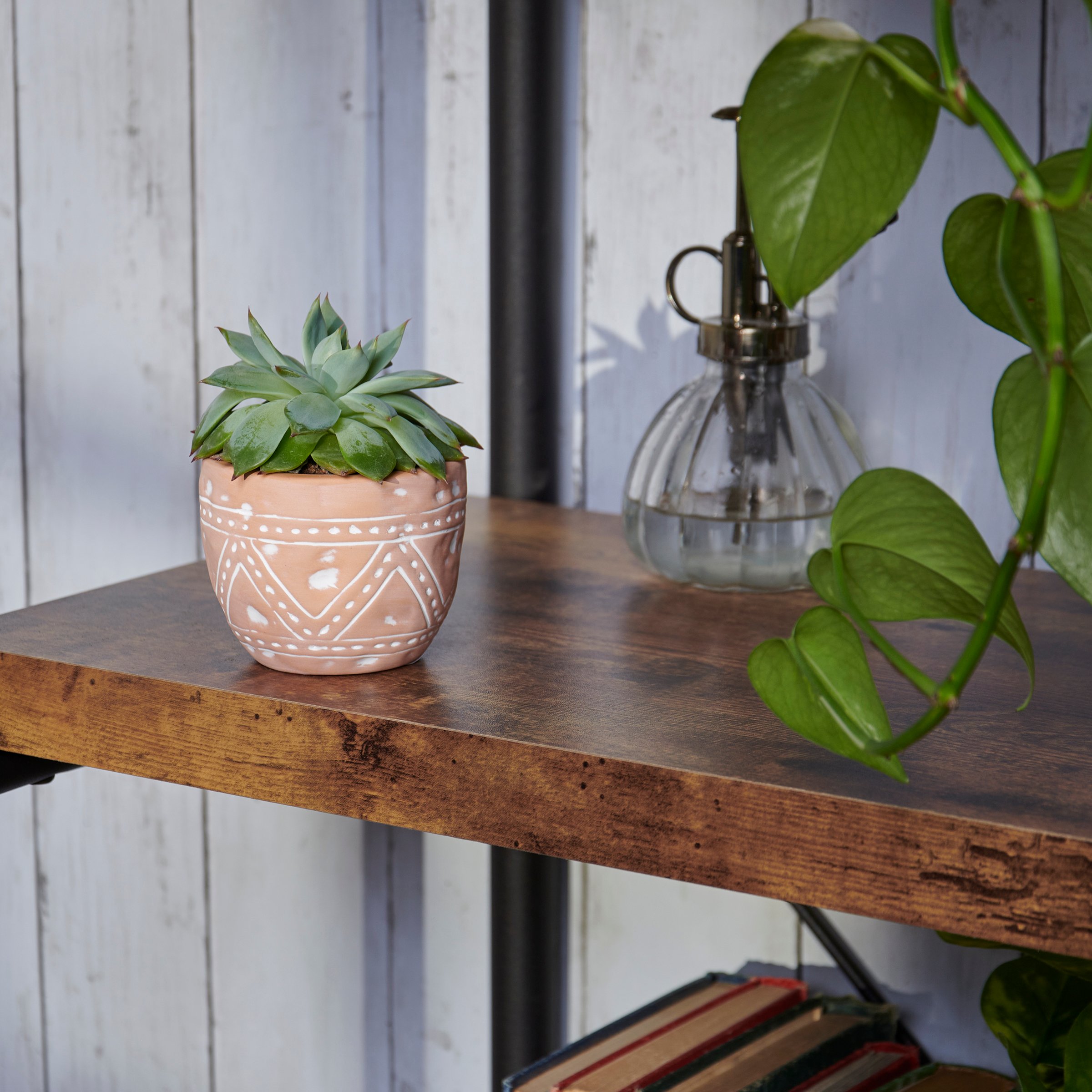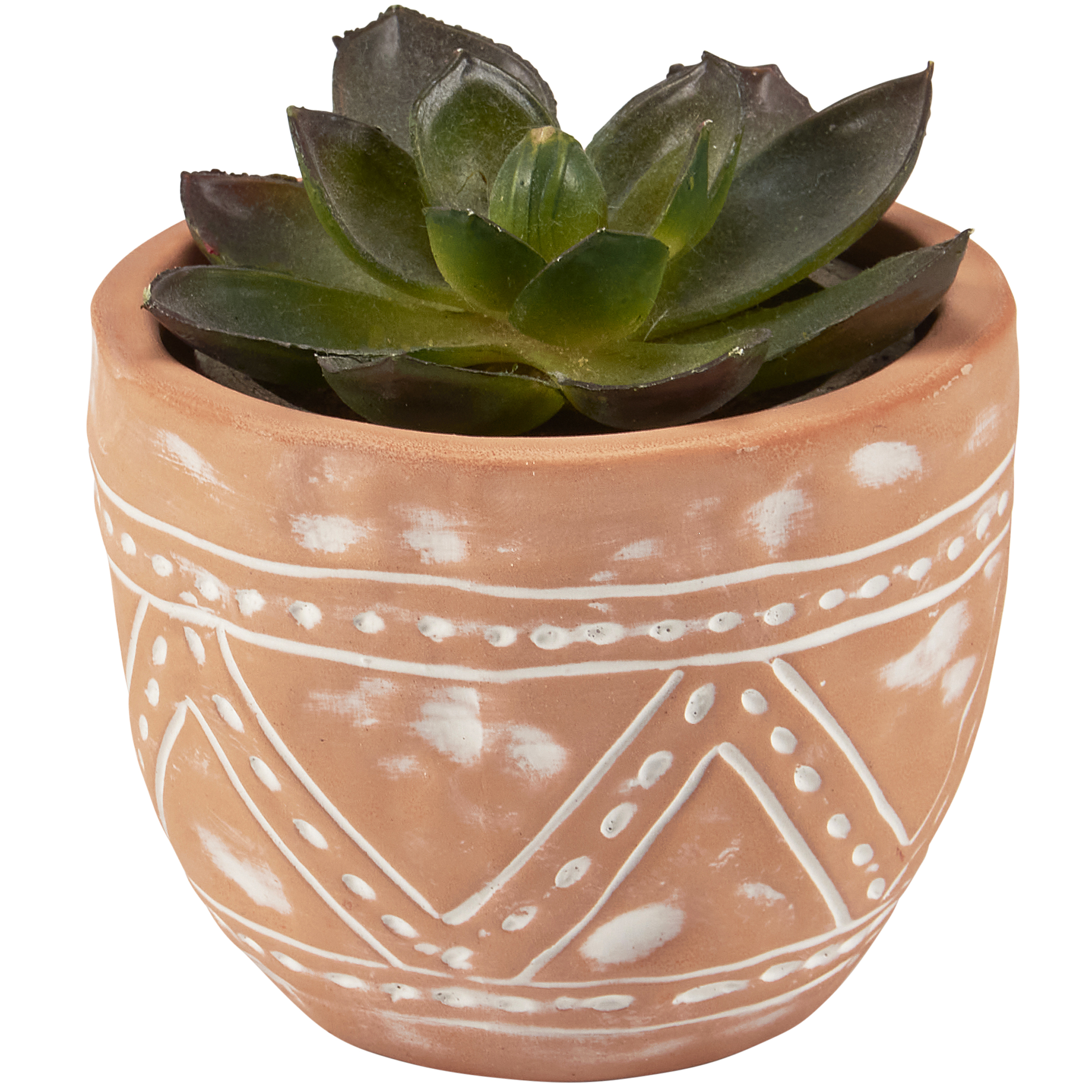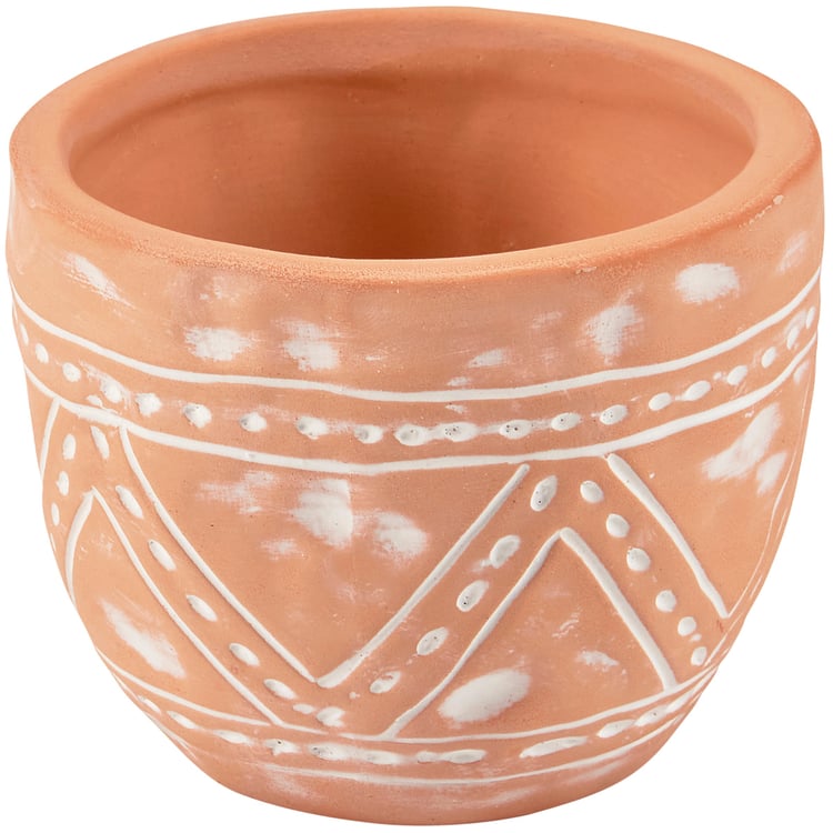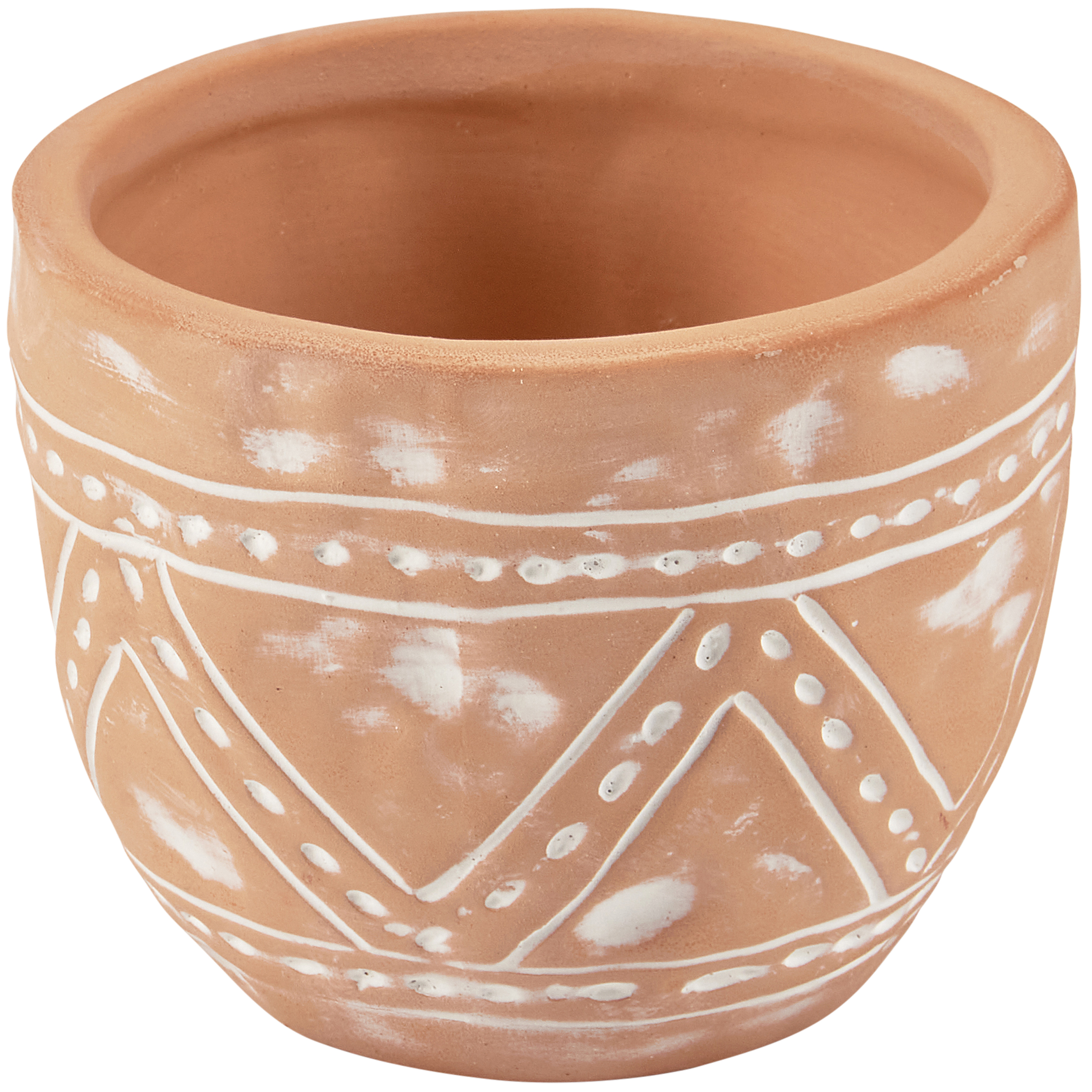 A terracotta pot from our Western Collection displaying bare ceramic with debossed western inspired patterns painted white to accent design. Our Western pot features opening on top to place succulents or décor. Greenery pictured not included. A western-themed everyday home accent with a variety of display options.