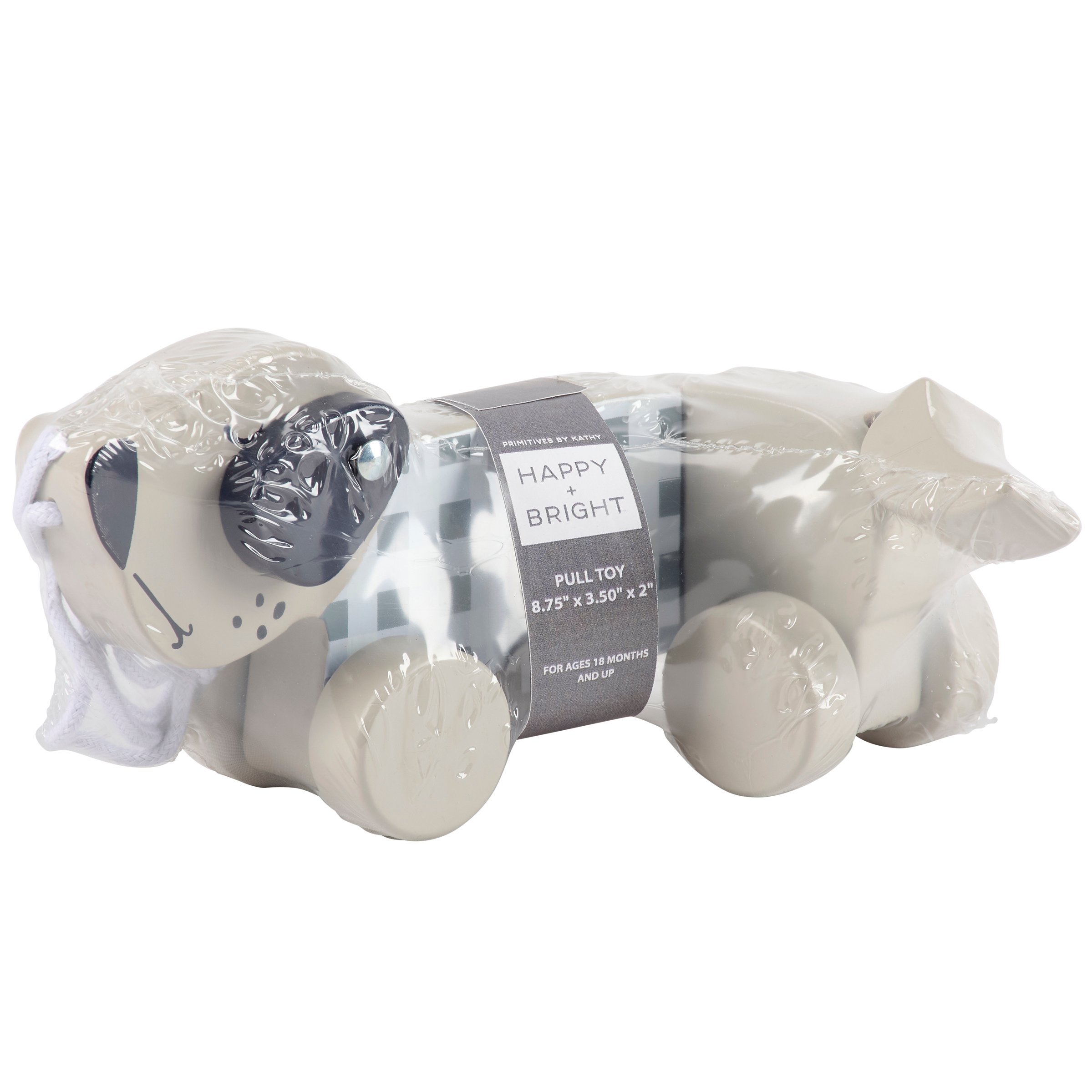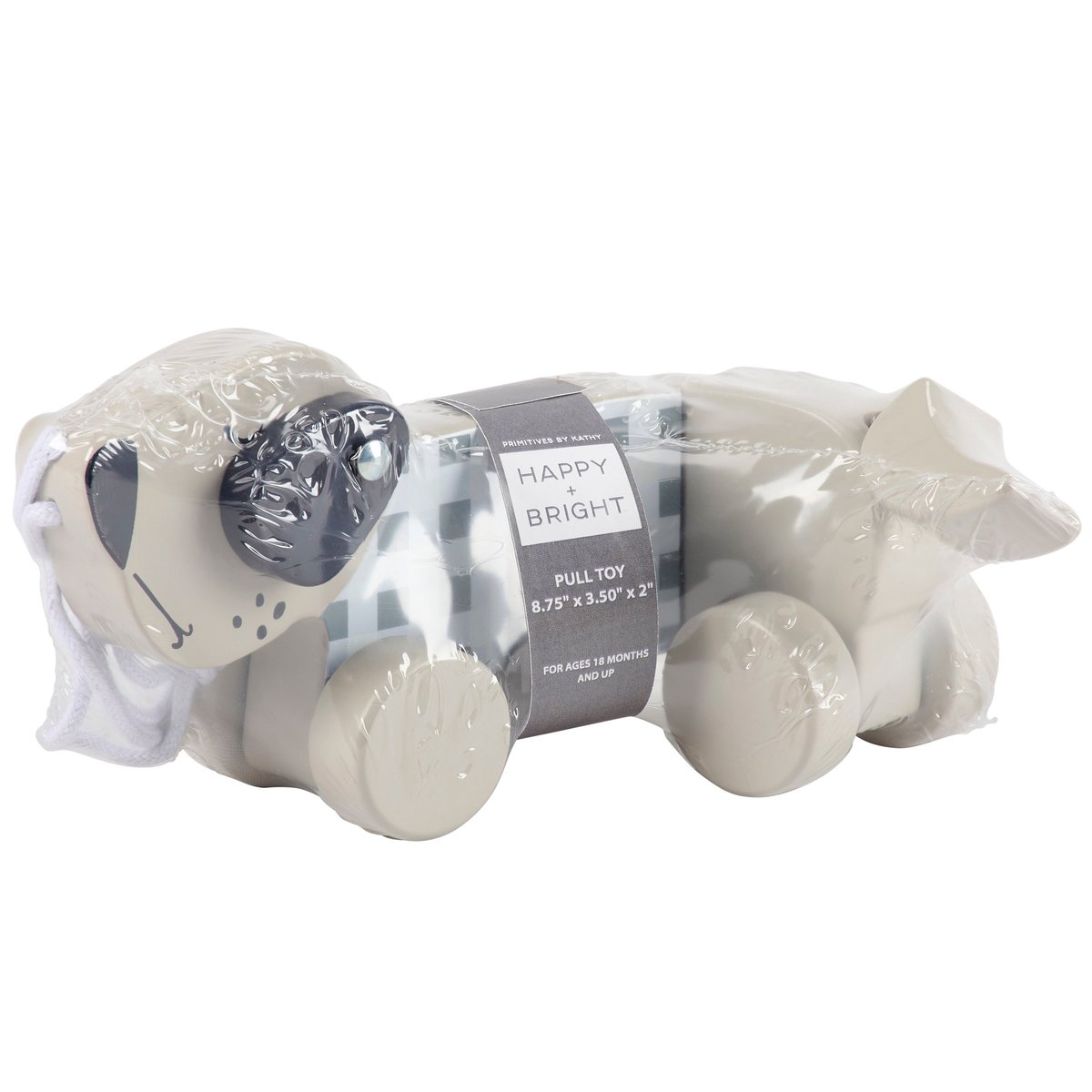 A fun wooden pull toy from our Baby & Kids Collection displaying a cute pet inspired design replicated from original block print style art. Pet pull toy features wooden dog on wheels with engaging elements during play including swaying ears and bouncing tail. Our Hound Dog pull toy is perfect for play with children 18 months or older and looks great on the shelf as child's room décor when not in use. A fun pet-themed gift for baby showers or everyday moments.