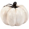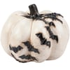 A decorative pumpkin from our Halloween Collection displaying a black and white pumpkin with sculpted bats going from the bottom to the stem. Our Batty pumpkin is ideal for as a seasonal home accent and complements well with décor in the collection to create a cohesive display. A rustic Halloween home accent with a variety of display options.