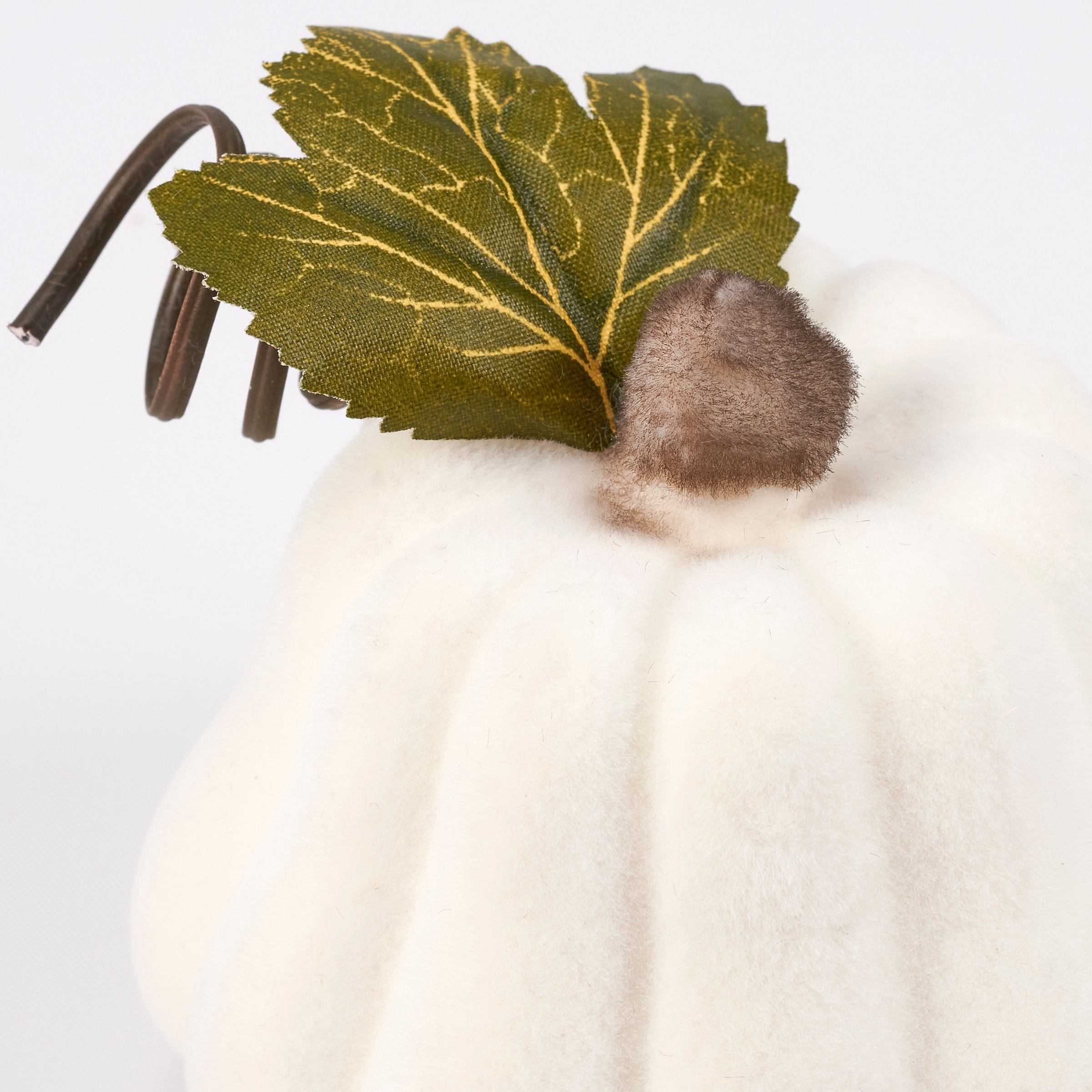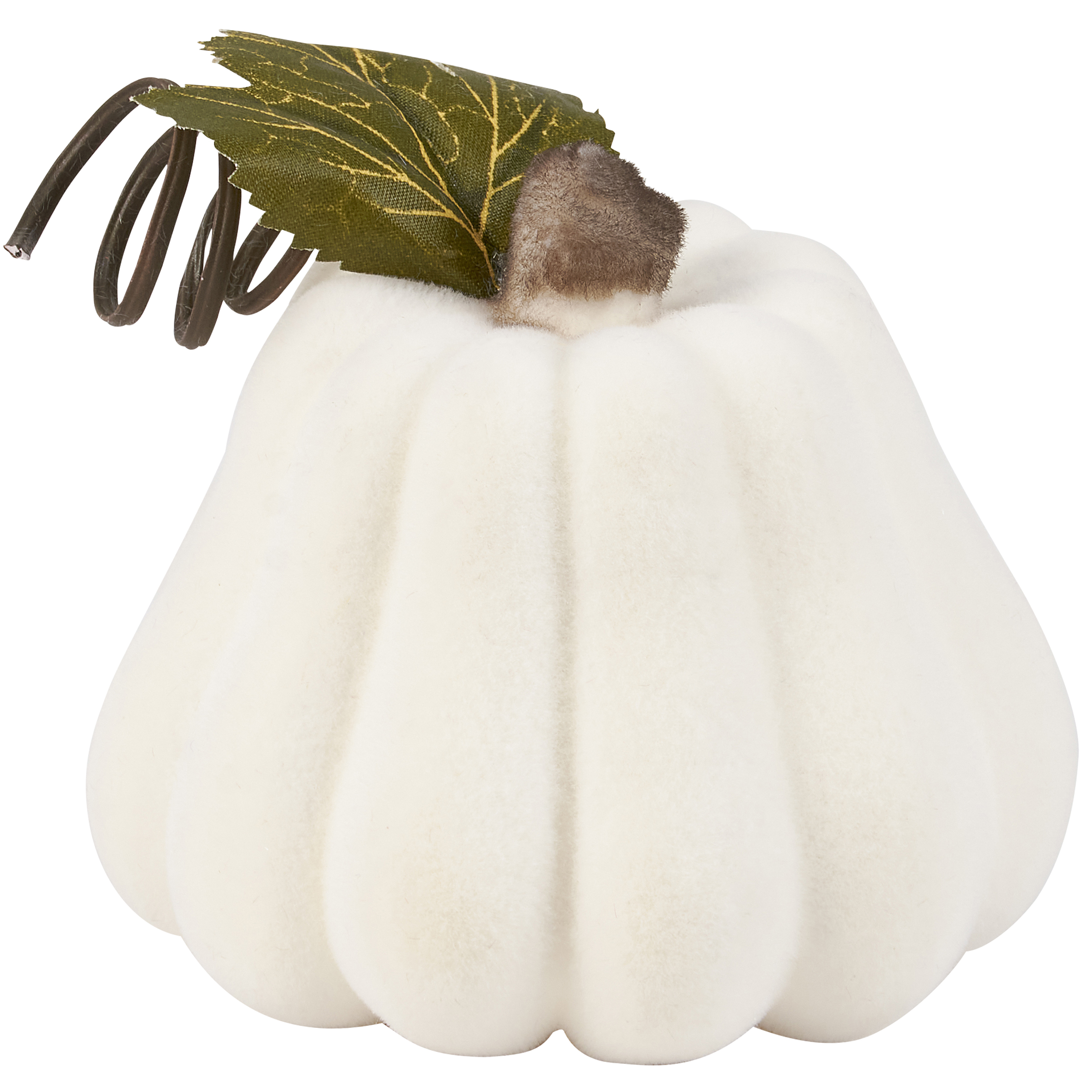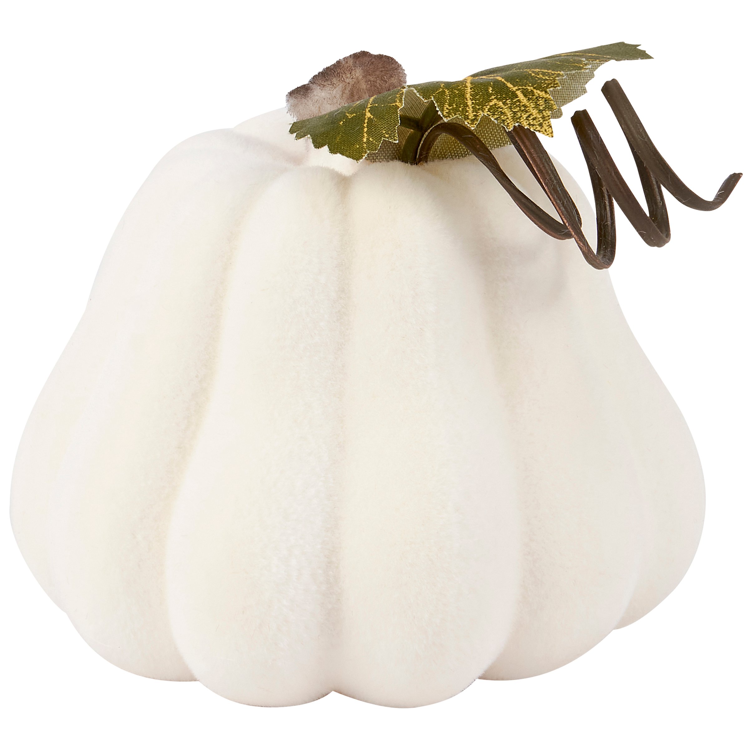 A decorative pumpkin from our Fall & Harvest Collection featuring a cream flocked finish and brown flocked stem with faux greenery accent for added interest. Our Cream Flocked pumpkin is designed to free-stand on any flat surface. Place in a display to add a touch of autumn or with other decorative pumpkins as a collection. A charming home accent with a variety of seasonal display options.