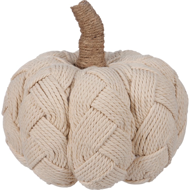 A decorative pumpkin from our Fall & Harvest Collection featuring a woven cream cotton design for a cozy aesthetic with a jute wrapped stem. Our Cream Woven pumpkin is designed to free-stand on any flat surface. Place in a display to add a touch of autumn or display with other decorative pumpkins as a collection. A cozy seasonal home accent with a variety of display options.