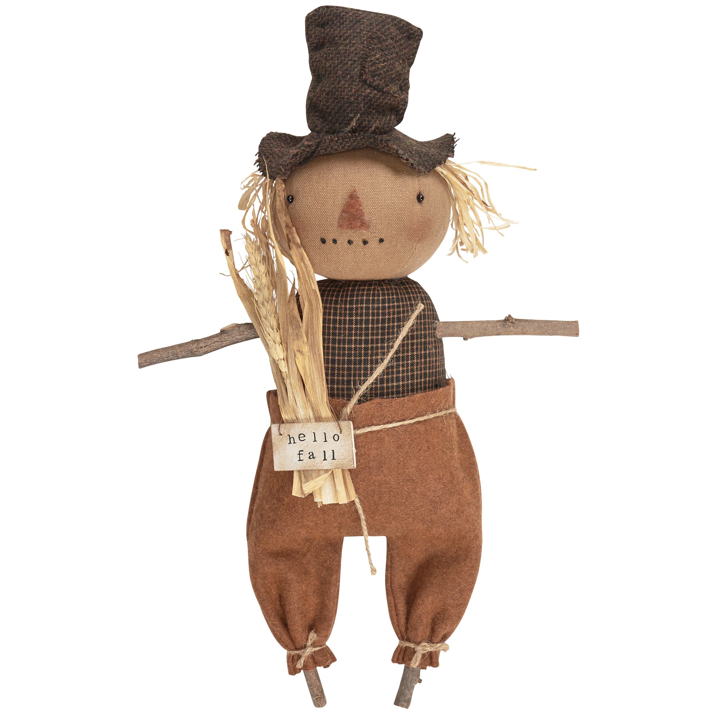 A primitive doll from our Fall & Harvest Collection displaying a scarecrow inspired outfit with a distressed sign that reads "Hello Fall." Seasonal doll is recreated from an original handmade piece using natural wood, fabric, and natural foliage details. Our Happy Henry doll is designed to free-stand in a sitting position on any flat surface for display. Contains small parts; this is not a toy. A rustic seasonal home accent to display alone or as a collection with other seasonal dolls.'