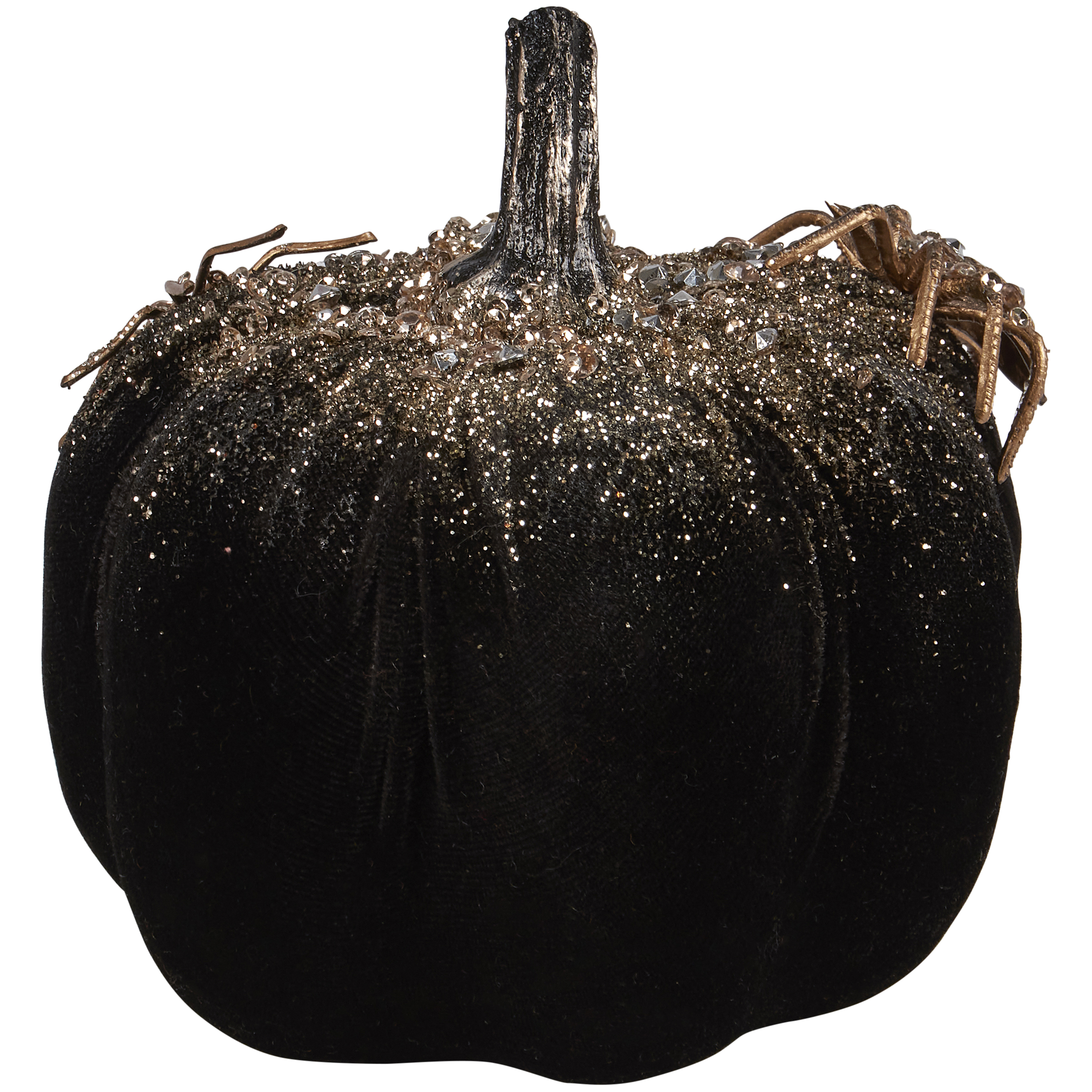 A decorative pumpkin from our Halloween Collection featuring a black velvet finish with gold glitter and spider accents on top for added interest. Our Glitter Spider pumpkin is designed to free-stand on any flat surface. Place in a display to add a stylish touch of Halloween or with other decorative pumpkins as a collection. A stylish Halloween home accent with a variety of seasonal display options.