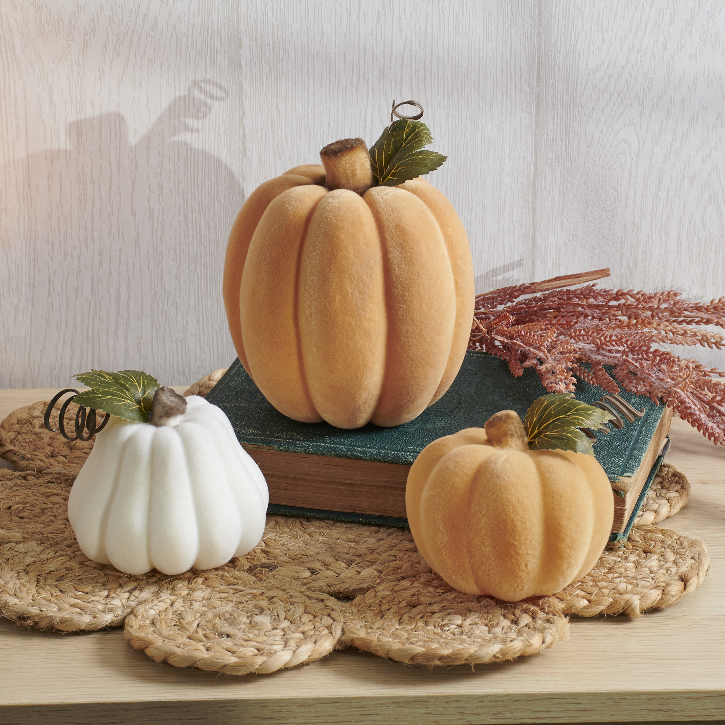 A large decorative pumpkin from our Fall & Harvest Collection featuring an orange flocked finish and brown flocked stem with faux greenery accent for added interest. Our large Orange Flocked pumpkin is designed to free-stand on any flat surface. Place in a display to add a touch of autumn or with other decorative pumpkins as a collection. A charming home accent with a variety of seasonal display options.