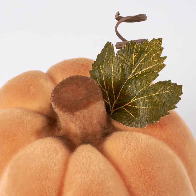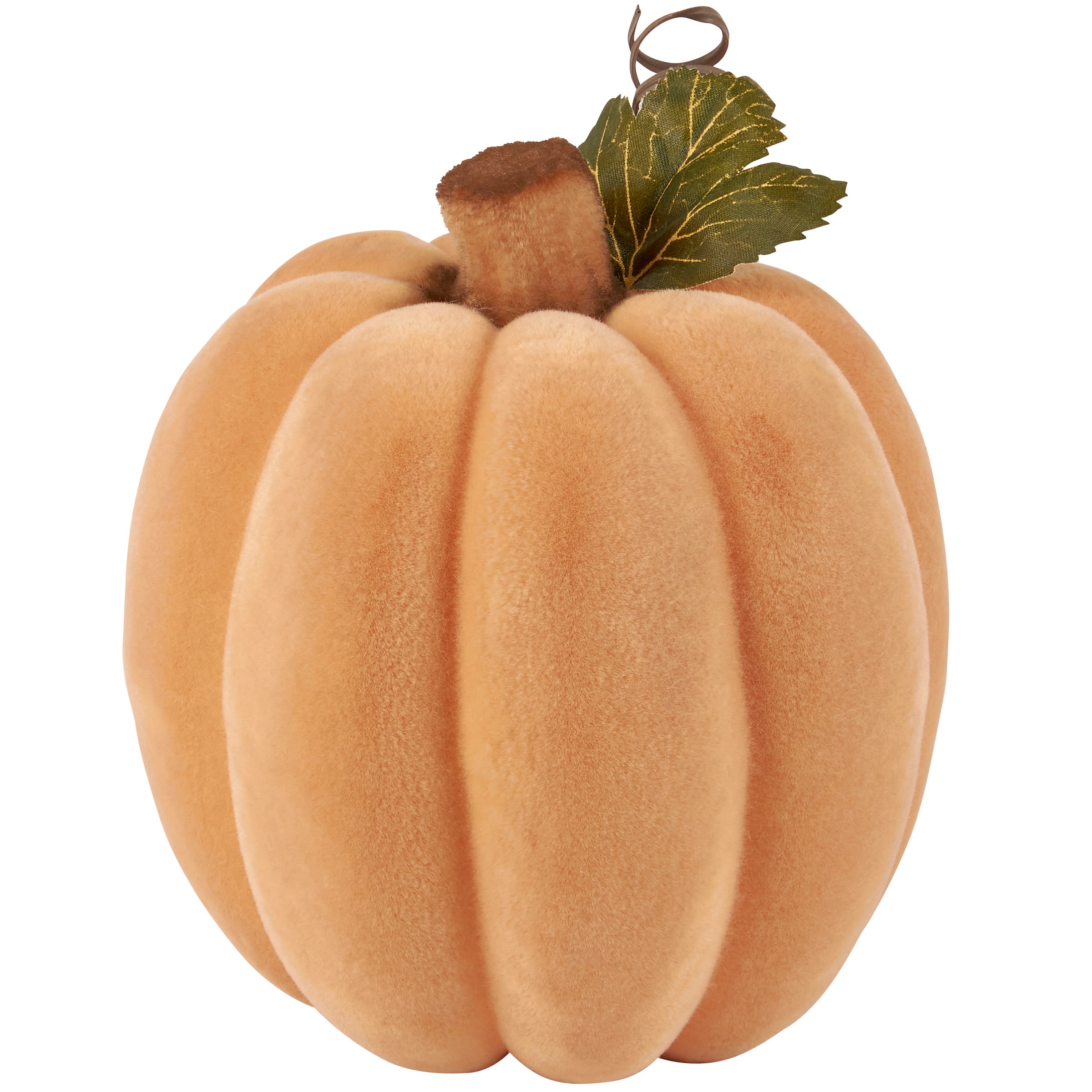 A large decorative pumpkin from our Fall & Harvest Collection featuring an orange flocked finish and brown flocked stem with faux greenery accent for added interest. Our large Orange Flocked pumpkin is designed to free-stand on any flat surface. Place in a display to add a touch of autumn or with other decorative pumpkins as a collection. A charming home accent with a variety of seasonal display options.