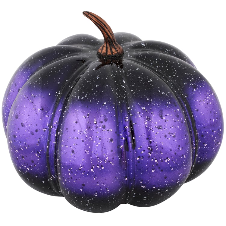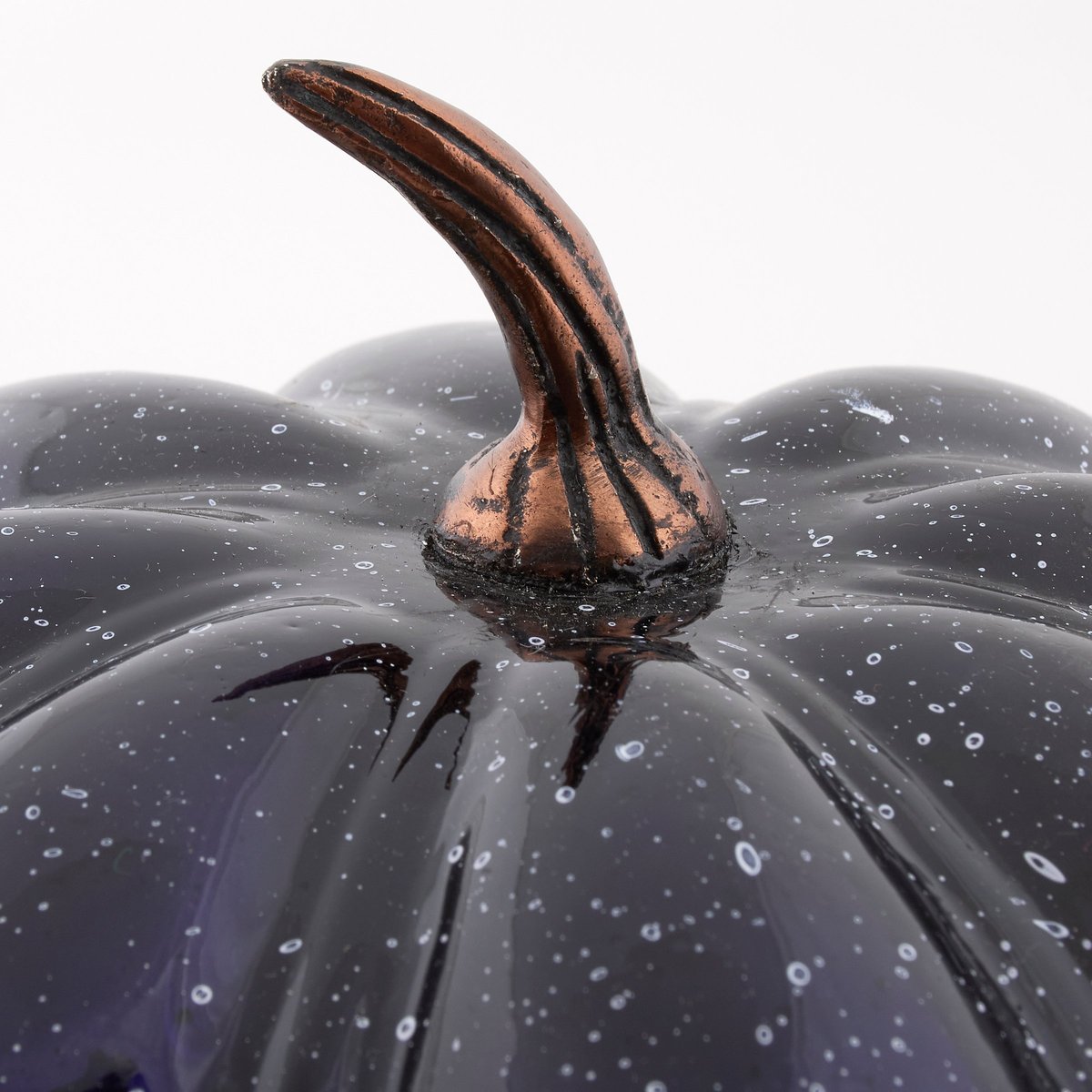 A large decorative pumpkin from our Halloween Collection featuring a dark glass pumpkin design with purple gradient effect and white speckle accents as well as a sculpted stem featuring an antique bronze finish. Our large Purple pumpkin is designed to free-stand on flat surface for display. Place in a display to add a touch of Halloween or with other decorative pumpkins as a collection. A moody Halloween home accent with a variety of seasonal display options.