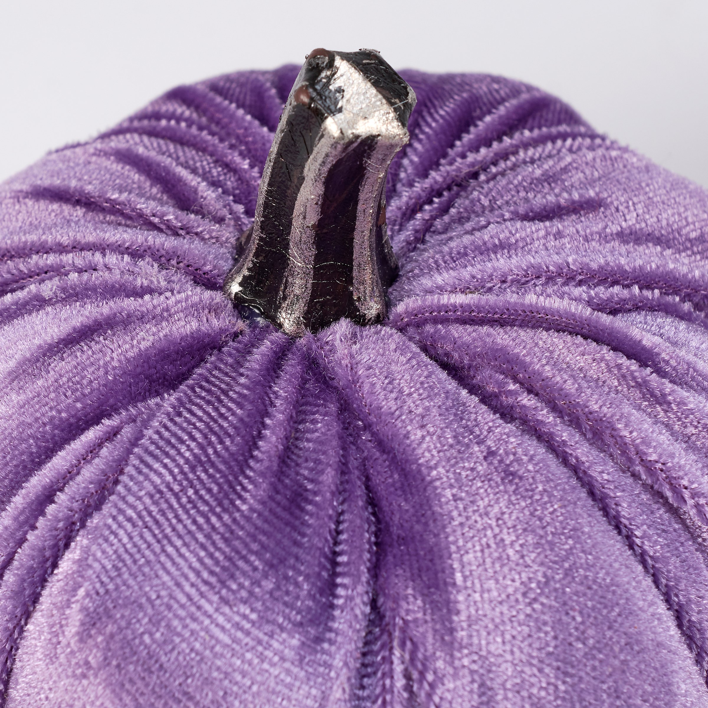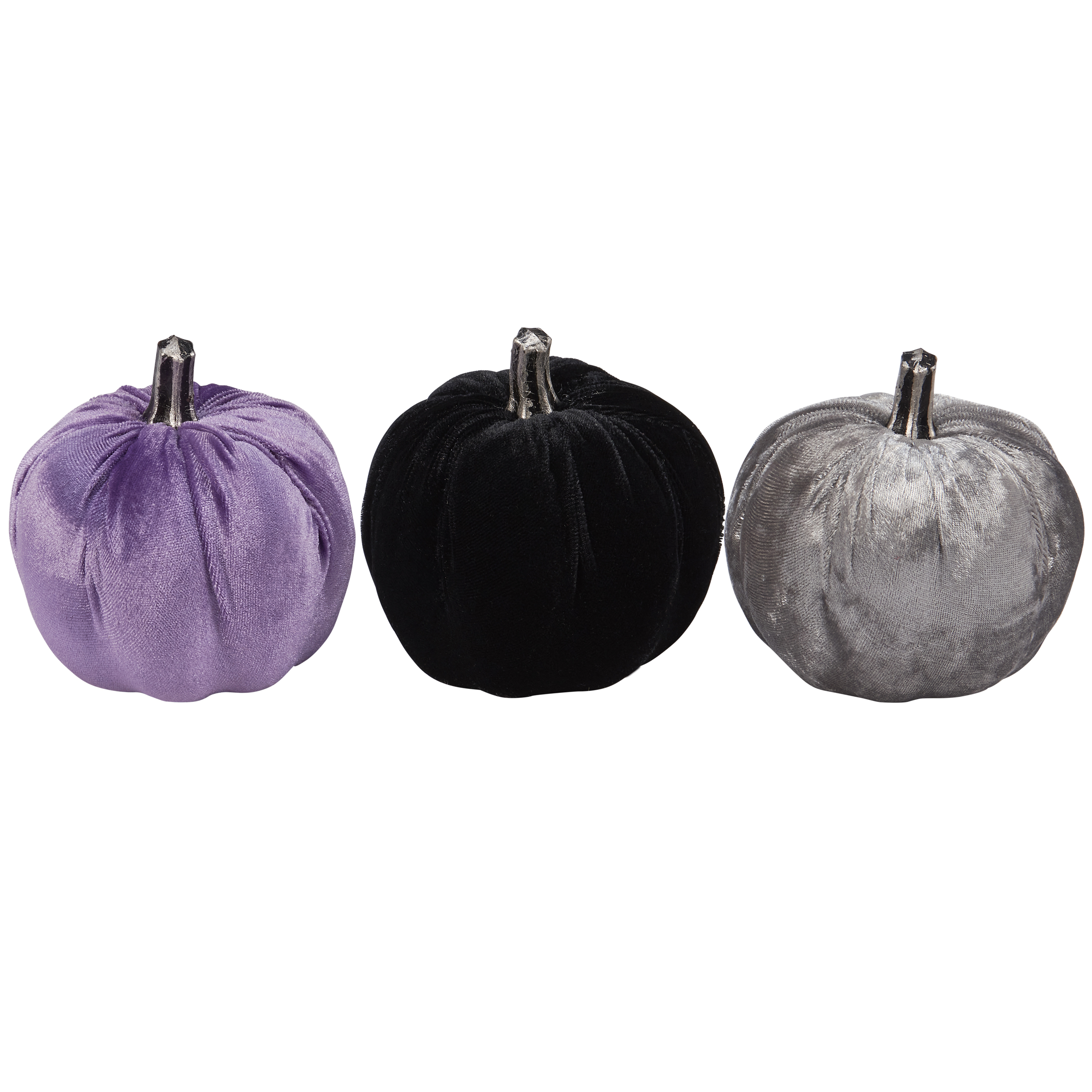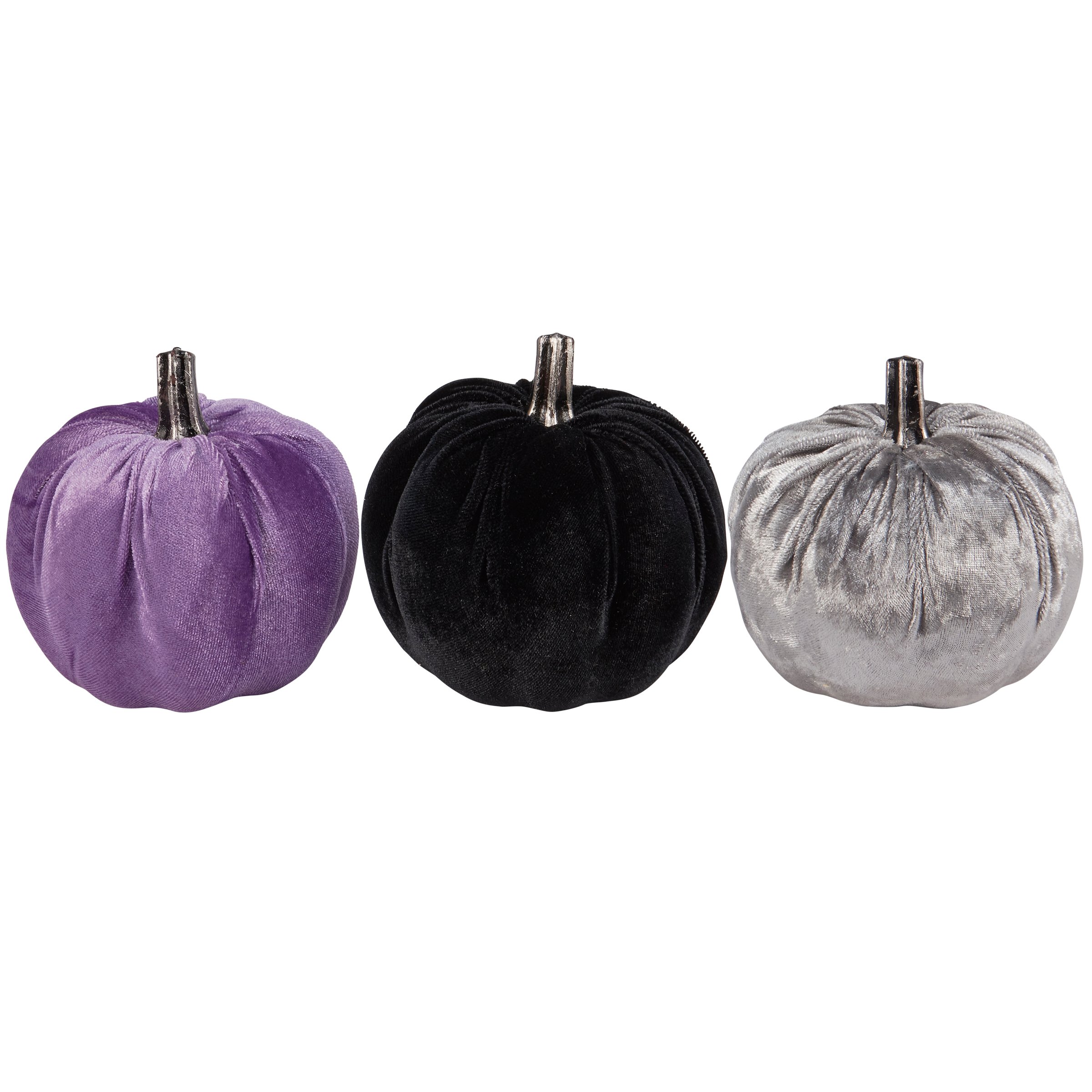 A set of three decorative pumpkins from our Halloween Collection featuring a purple, black, and silver velvet pumpkin with metallic silver stem. Our Moody Velvet pumpkins are designed to free-stand on any flat surface. Place in a display to add a stylish touch of Halloween or with other decorative pumpkins as a collection. A set of fun Halloween home accents with a variety of seasonal display options.