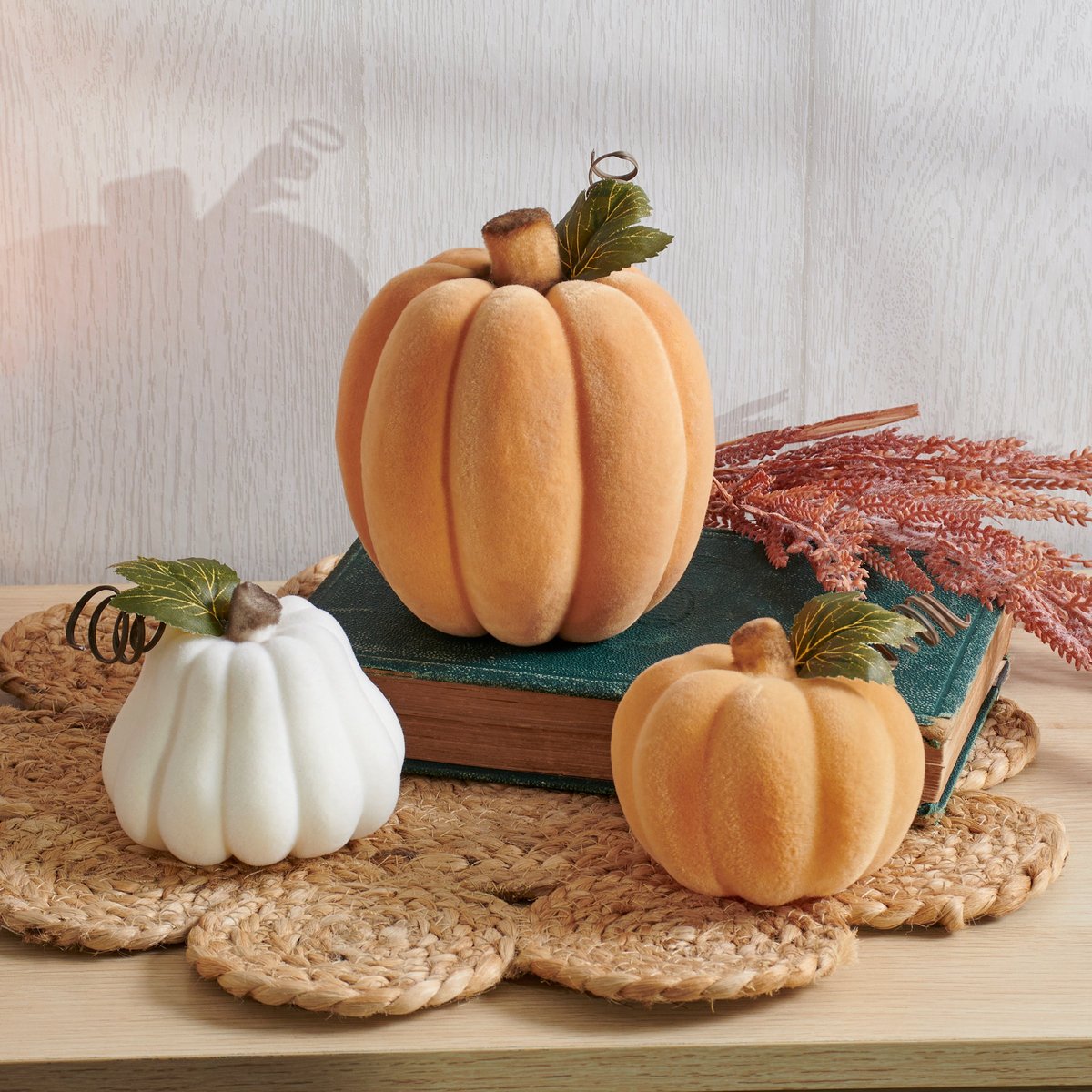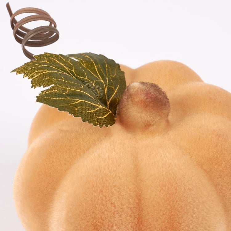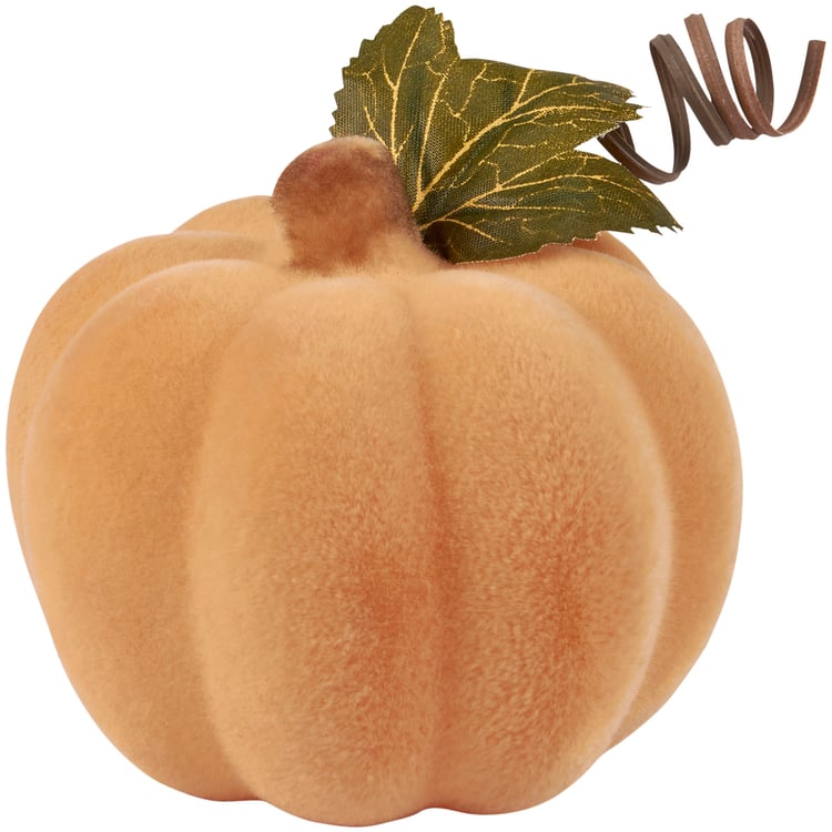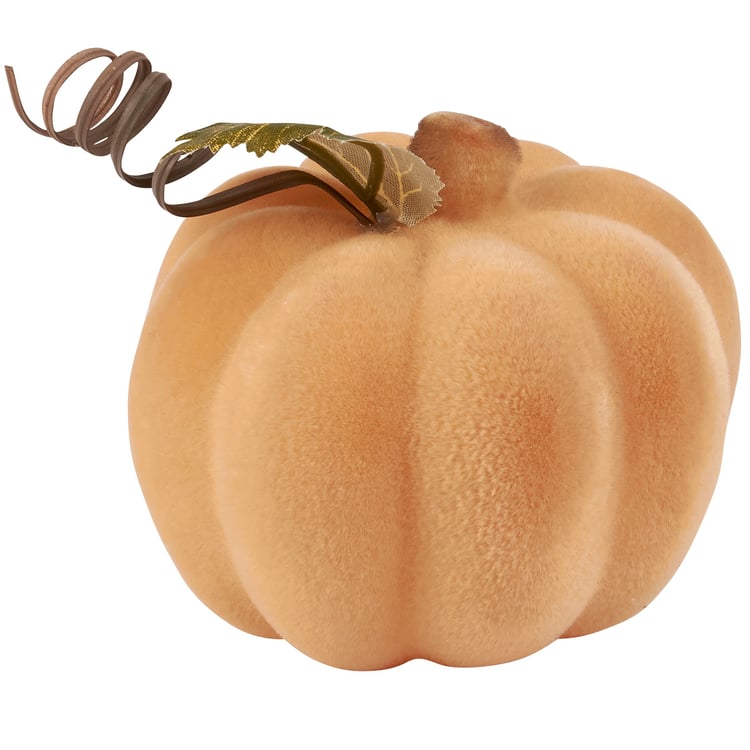 A small decorative pumpkin from our Fall & Harvest Collection featuring an orange flocked finish and brown flocked stem with faux greenery accent for added interest. Our small Orange flocked pumpkin is designed to free-stand on any flat surface. Place in a display to add a touch of autumn or with other decorative pumpkins as a collection. A charming home accent with a variety of seasonal display options.