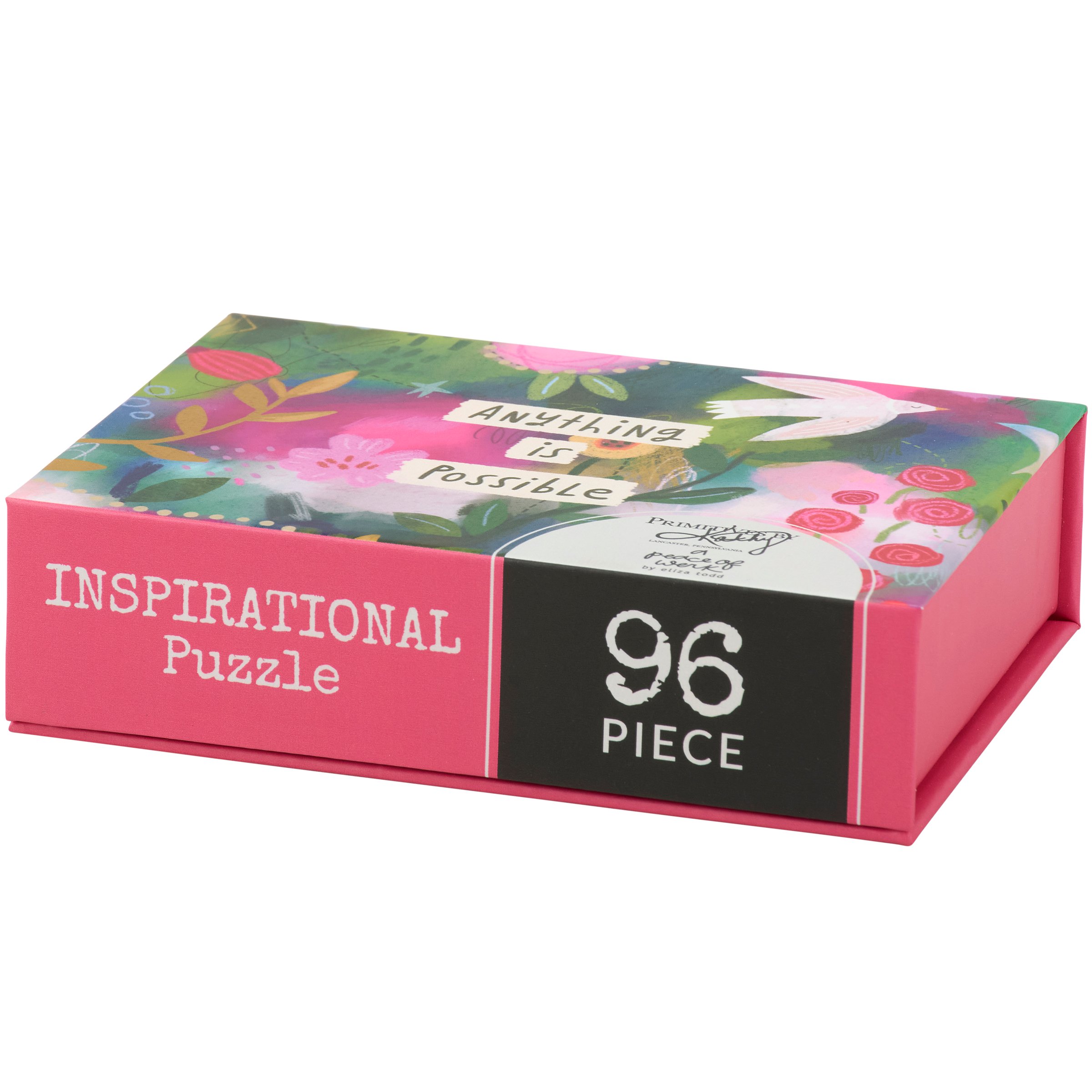 A 96 piece puzzle from our Inspiration & Blooms Collection displaying vibrant abstract art of florals and a bird with an inspirational sentiment that reads "Anything Is Possible." Inspirational design is replicated from original hand illustrated art. Puzzle pieces are packaged in a resealable bag and enclosed in a sturdy box that is small enough to easily store in an everyday bag or luggage and puzzle whenever the moment arrives. Our Anything Is Possible puzzle includes a print displaying the full puzzle image for reference. Contains small parts; this is not a toy. An inspirational gift perfect for daily motivation and on the go fun.